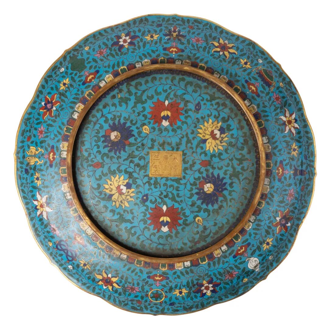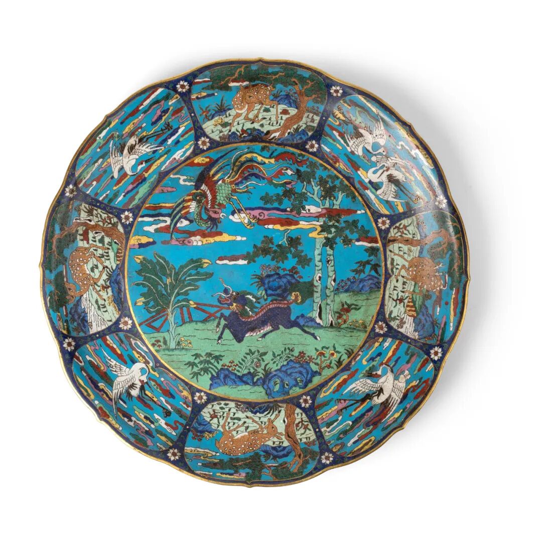 Lot 43 清 康熙款 铜胎掐丝珐琅凤凰麒麟图大盘