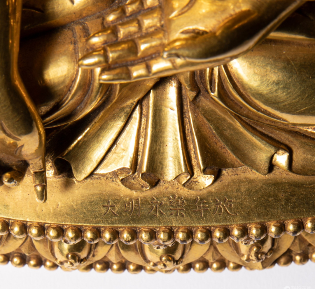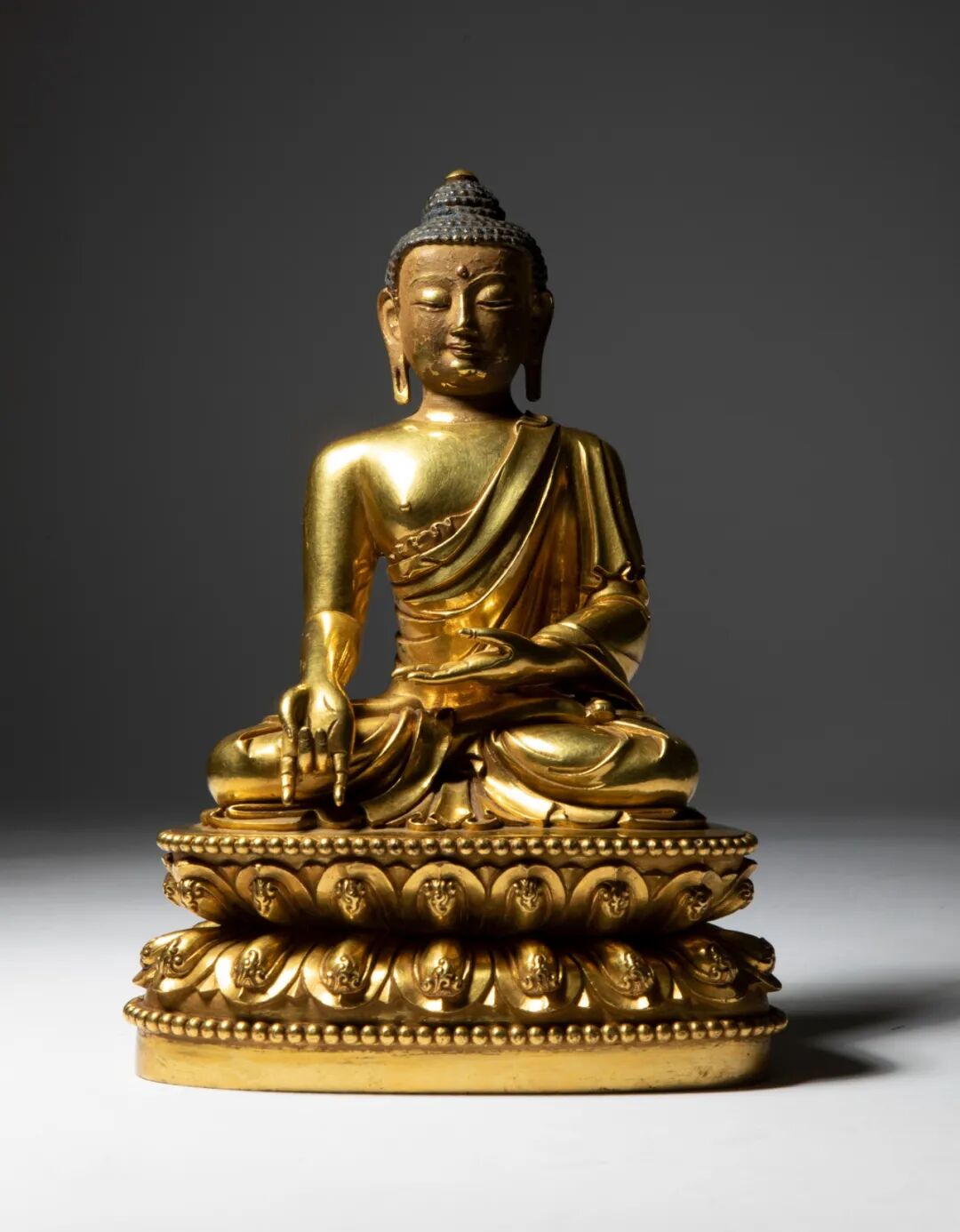 注:两尊高度相似铜鎏金释迦摩尼佛座像,永乐款及年代,分别售出于纽约苏富比,2012年9月11日,拍品183及香港苏富比,2013年10月8日,拍品3075。可资比较。*拍品44至65号为《法相庄严——亚洲宗教造像》主题拍卖特辑