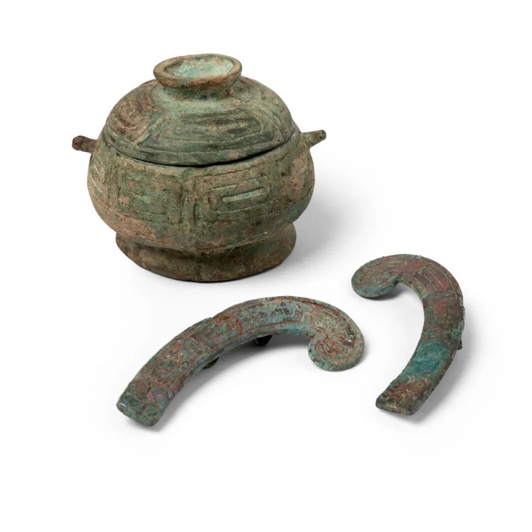 Lot 22 西周 青铜重环纹簋及盖 及 青铜重环纹饕餮首角型车马饰一对(共三件)尺寸:簋宽12.5cm,净重1066克;车马饰各宽12.1cm、12.5cm,总重162克注:台北故宫藏有一件相似的西周青铜重环纹簋及盖,馆藏号:中铜551;另一件西周横向重环纹簋及盖,售于伦敦邦翰斯,2021年6月7日,拍品431,可资比较。