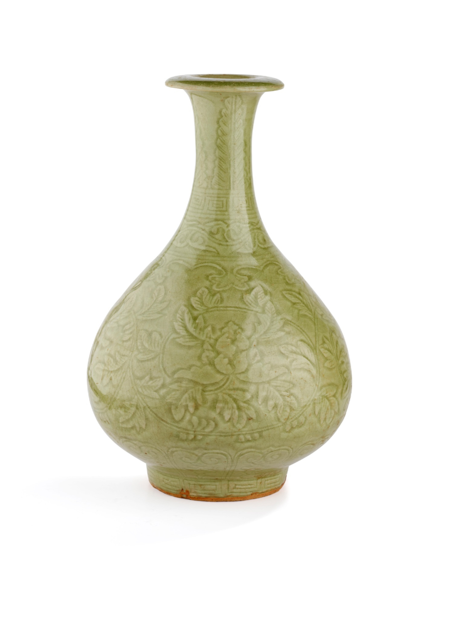 Lot 173 明早期 龙泉窑青釉划花花卉纹玉壶春瓶来源:加拿大私人收藏;前香港私人收藏,藏家移民至加拿大前藏于香港。注:台北故宫藏有五件类似龙泉青釉划花花卉纹玉壶春瓶,均为明代,馆藏号分别为:故瓷9976、11899、14574、中瓷1404及3978;颐和园博物馆藏有形制及釉水相似的龙泉玉壶春瓶;另一件龙泉玉壶春瓶,明洪武,售于纽约苏富比,2019年3月20日,拍品607。可资比较。*拍品169至173号,单色釉瓷器均出于此加拿大私人收藏