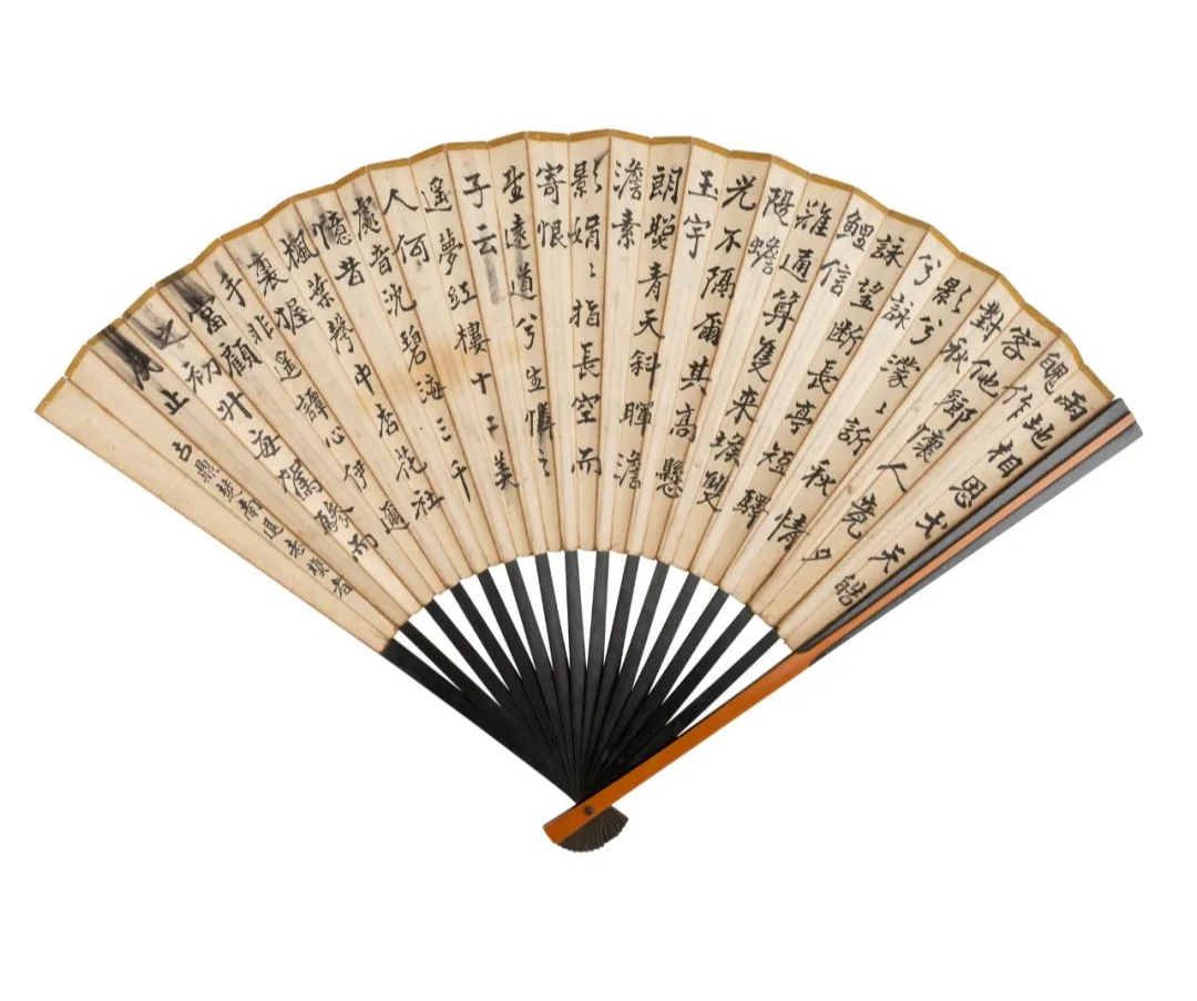 Lot 92 清 唐寅款 乌木股嵌竹黄水墨人物及行书折扇