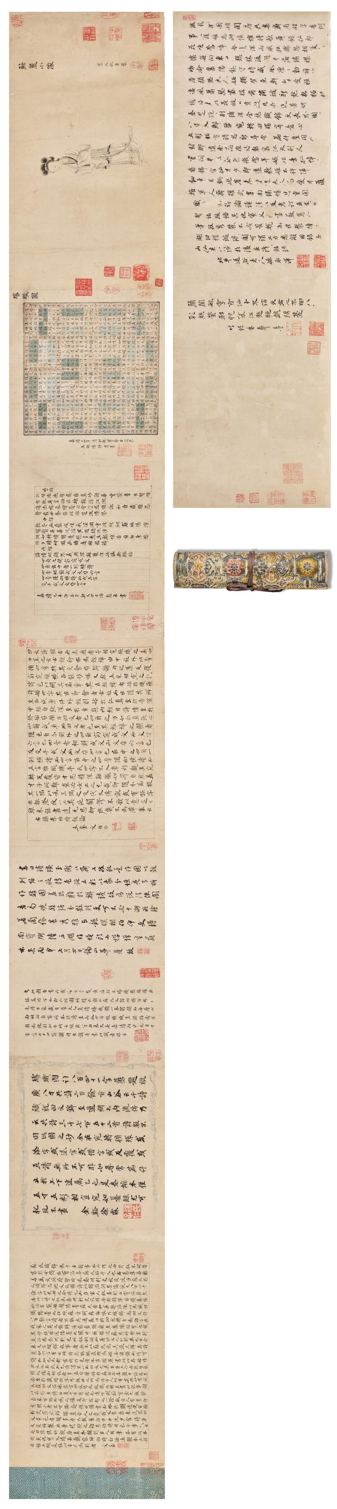 此次上拍的《苏蕙璇玑图》,由仇英绘上苏蕙小像,以细笔白描勾勒,不着一色,烟鬓淡雅,意韵天然。只见苏蕙长身玉立,娥眉淡扫,宽袍广袖上饰以精美云纹团花,衣袂飘飘,宛若仙子。素手纤纤,一笺在握,正是「腹有诗书气自华」,活泼泼地才女形象。后面的一幅,则由陆师道以蝇头小楷于乌丝栏五色笺上手录“璇玑图”回文诗,并署年“嘉靖十四年清和既望”,即西历1535年。彭年同纸题跋署年“嘉靖乙未(1535)”,其后无锡大收藏家华夏署年丙申(1536),谢时臣署年嘉靖丙申(1536)。推知仇英所绘亦应成于相若时期,当时仇英四十岁上下,创作亦进入鼎盛时期。![]()