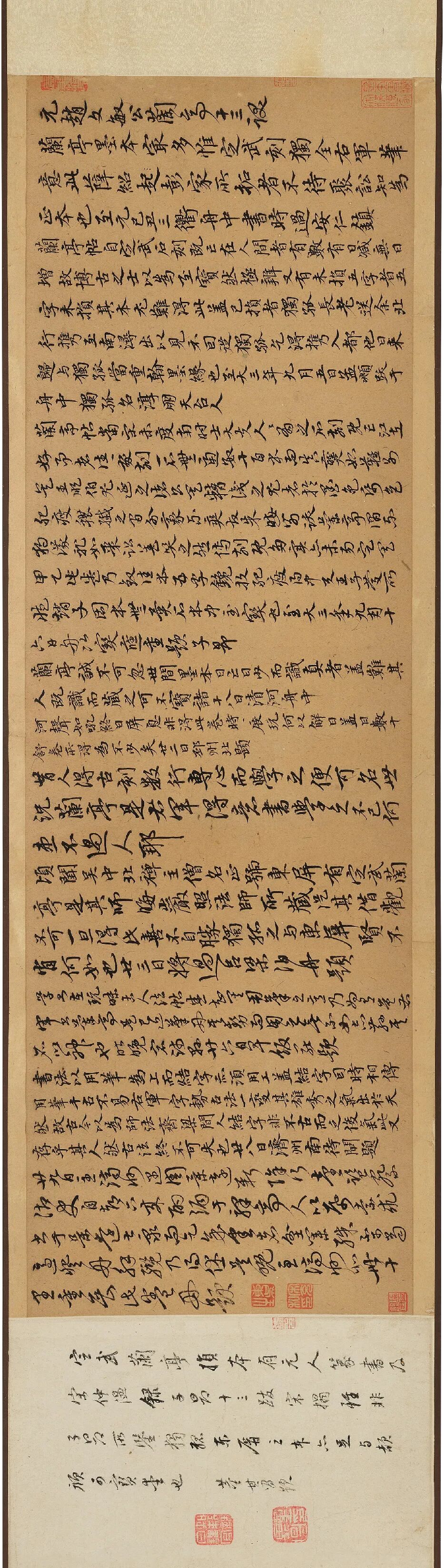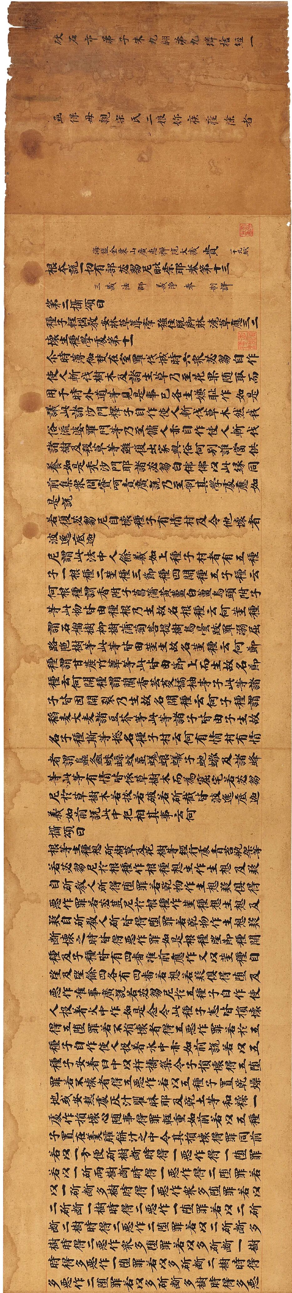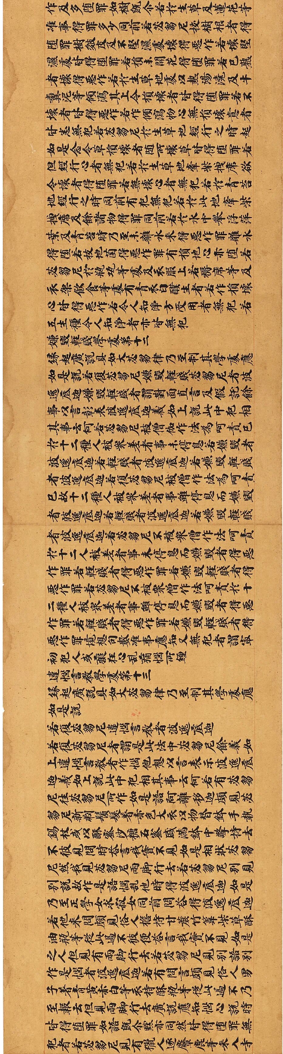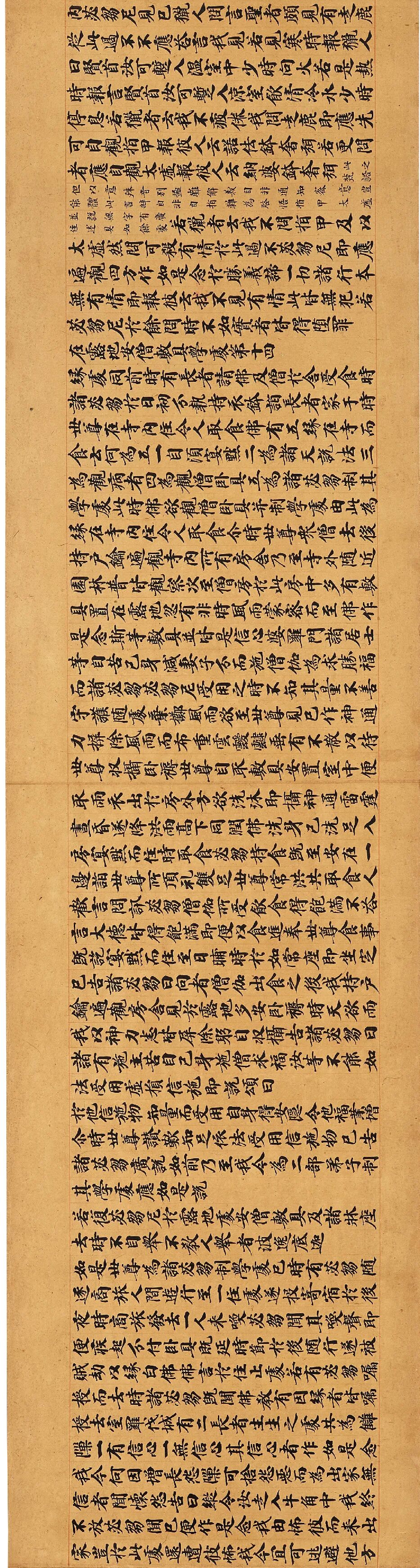 这件佚名《宋人写经》,以十九张金粟山写经纸连接而成,首尾俱全。宋人写经多用于供奉,为此禅院在制作时以蚕丝入纸,添有植物黏液、胡椒或辣椒等驱虫之物,将皮纸多层重迭培干成厚,成品纤维匀细,纸质坚韧,内外皆蜡。后世文人常揭多层用之,如文征明、祝允明,甚至乾隆皇帝,所用皆为揭裱后的藏经纸背面。