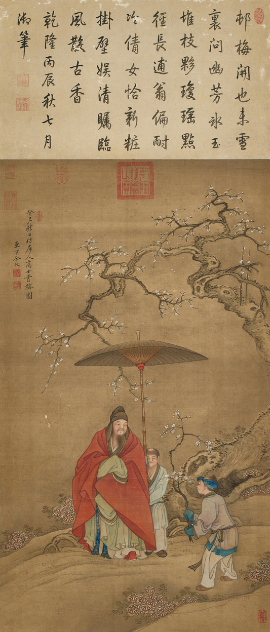 该作被收录于《石渠宝笈初编》。值得一说的是,收录于《石渠宝笈》的冷枚作品只有14件,能市场流通者更为罕见,以“沧海遗珠”来形容此次《高士赏梅图》的释出毫不为过。其诗堂上有乾隆于乾隆元年(1736年)的题诗,表达了他对画家的高度赏识。