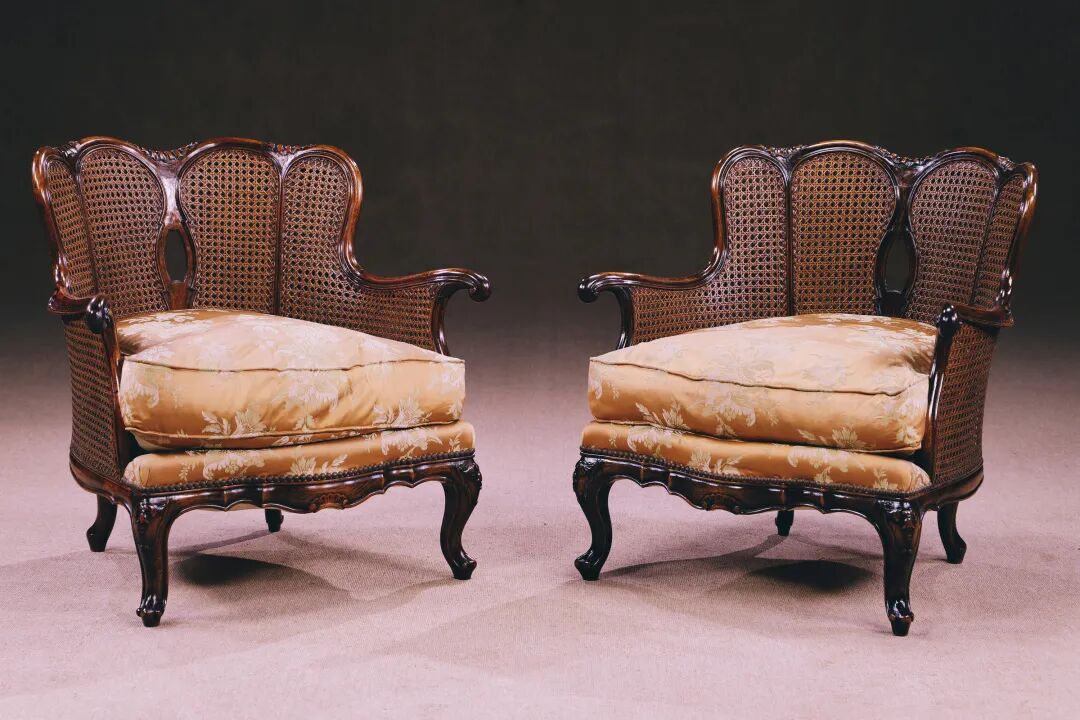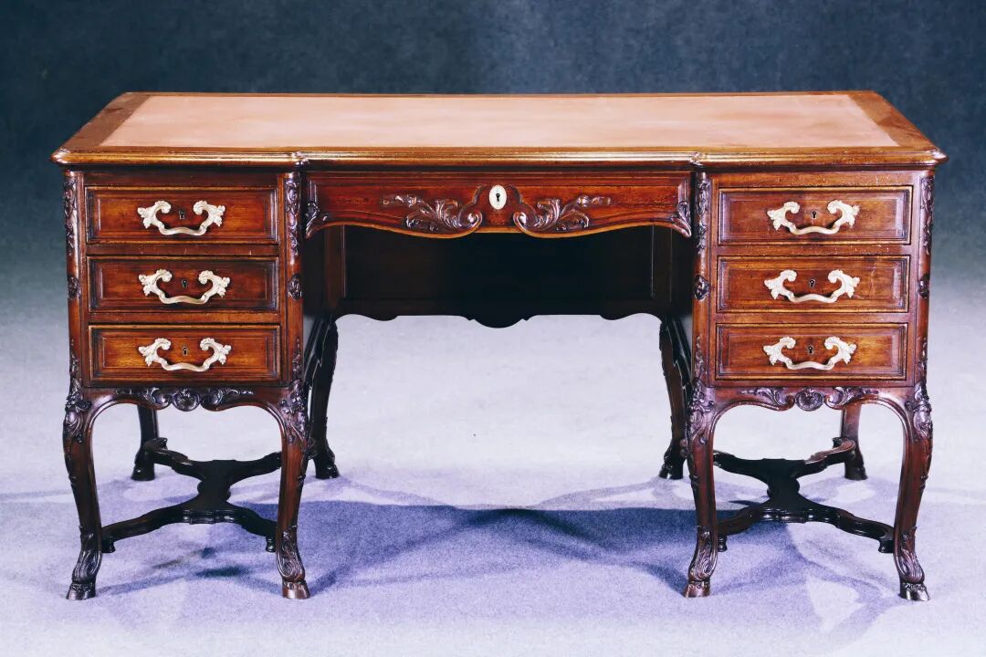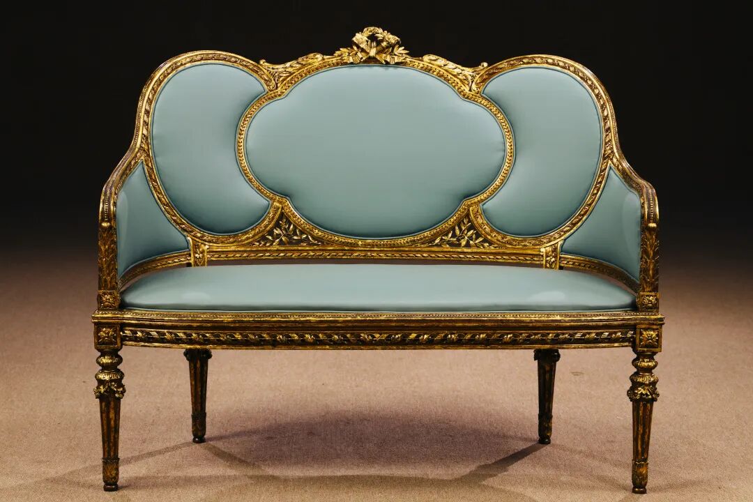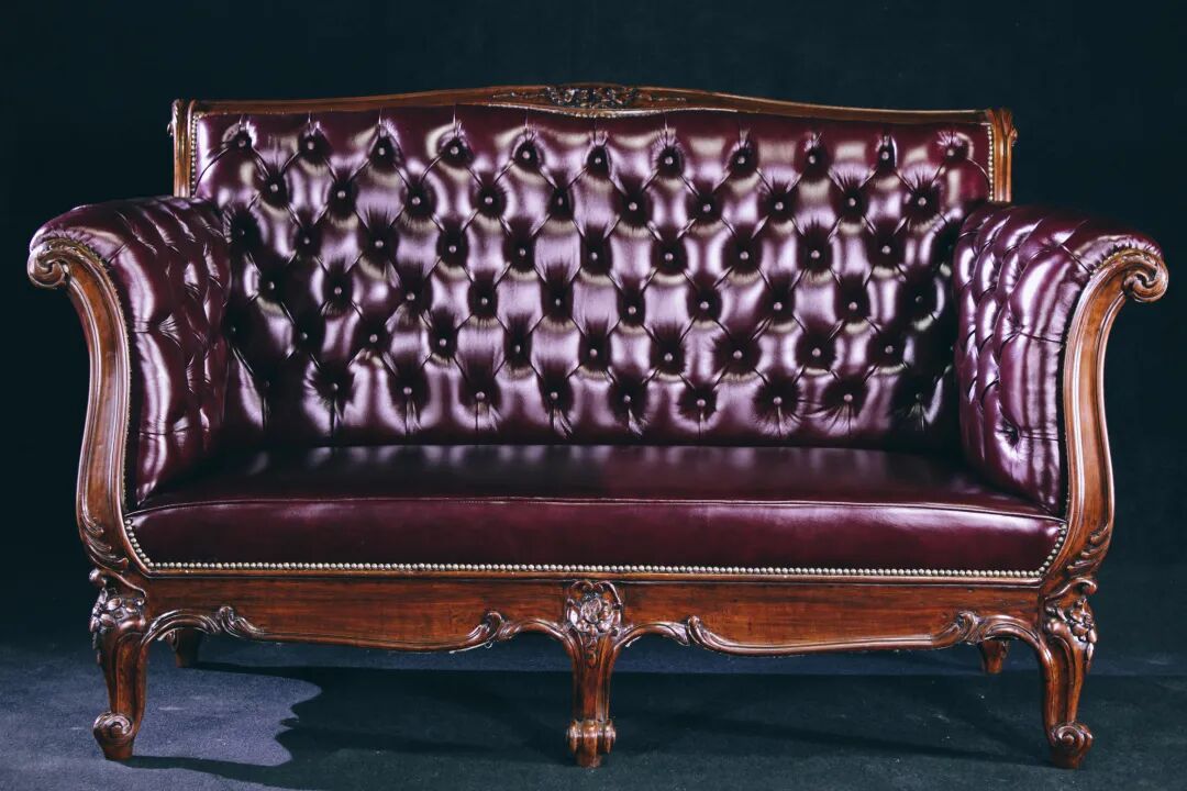 路易十五式胡桃木酒红色牛皮面双人沙发