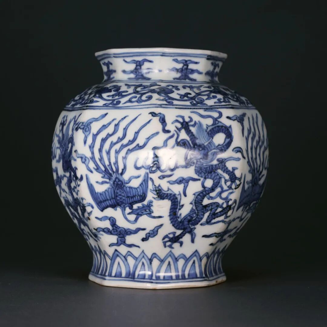 此罐以青花描绘龙凤纹样,生动形象,周围衬以云纹,层次清晰,是不可多得的清雅精良文房器具。