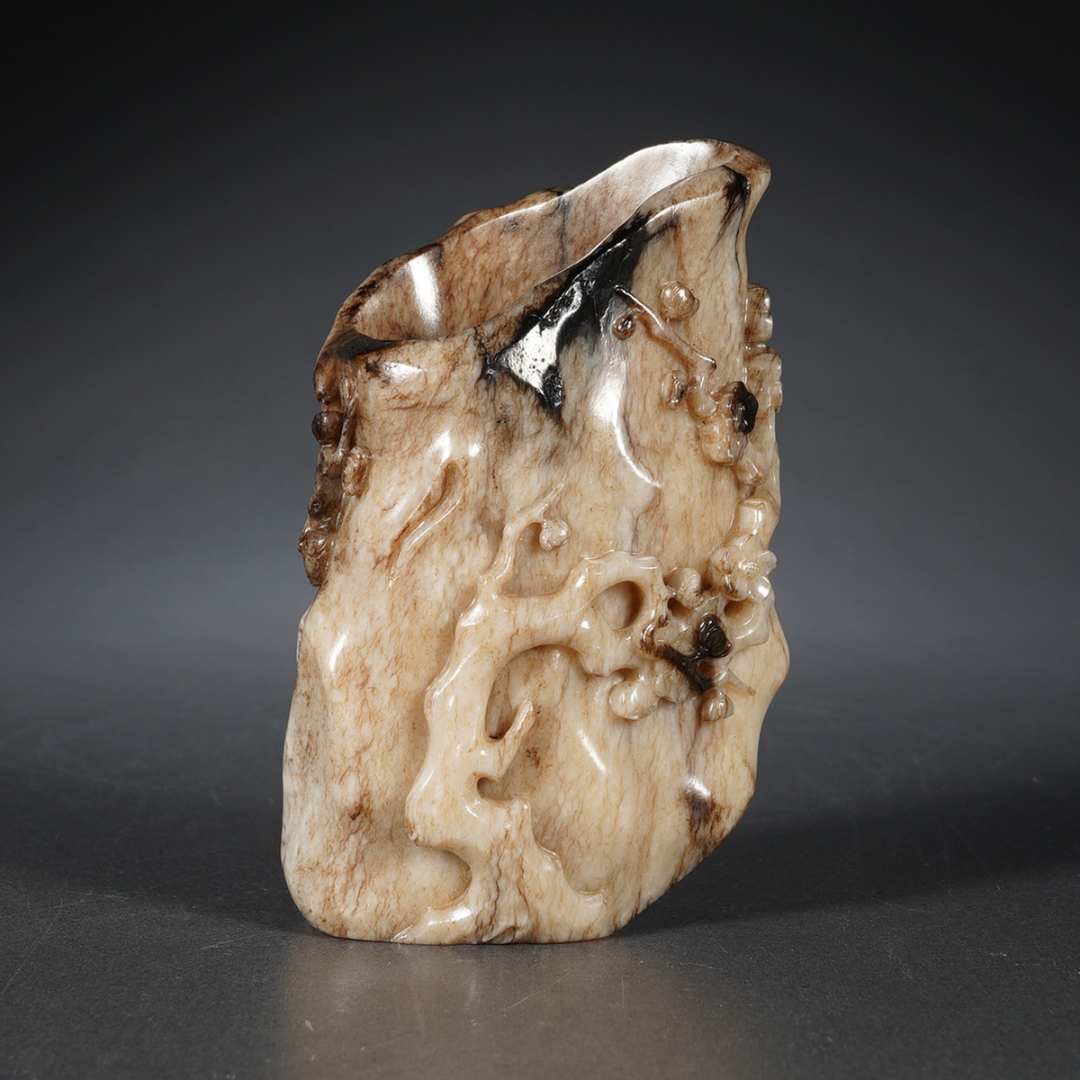 玉质带沁,整体雕工简洁明快,刀法虚实相间,梅花树表面凹凸起伏的质感刻划自然,栩栩如生,巧夺天工。