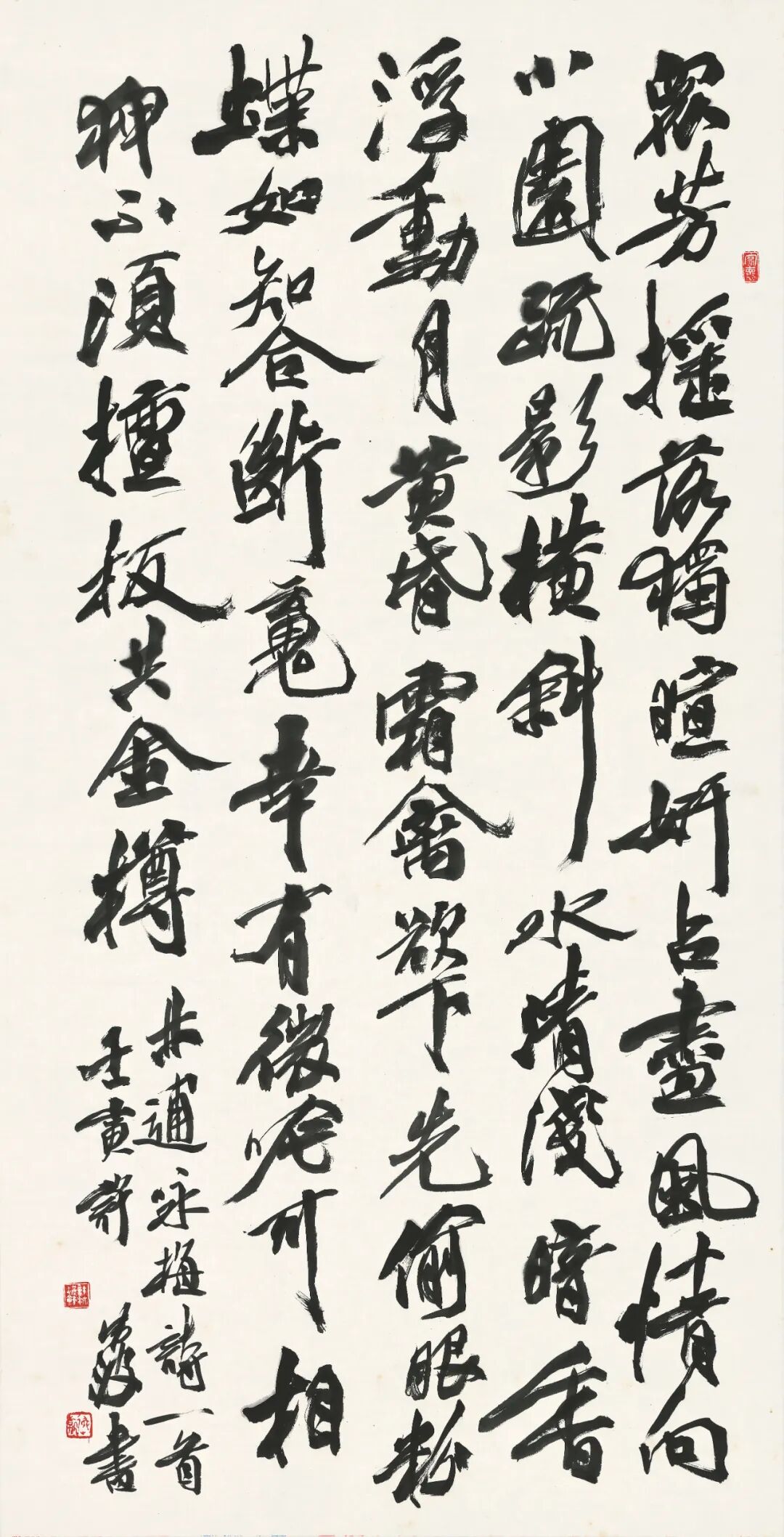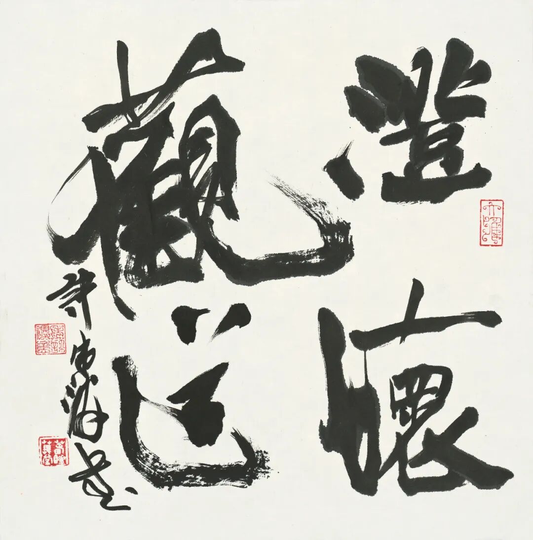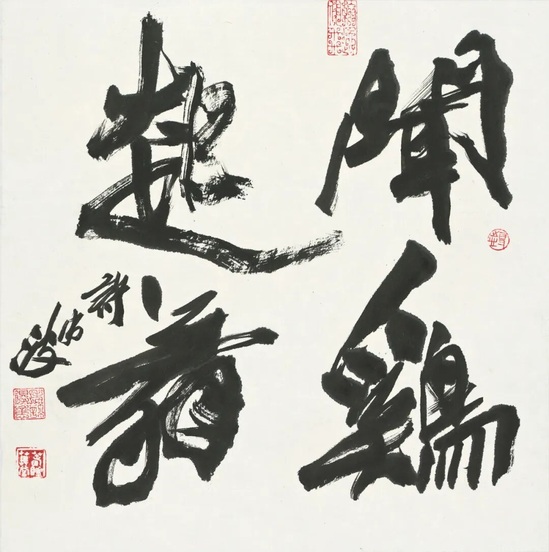同时,他又特别对画家的题跋书法加以研究,从中领略书画同源,相辅相成的道理。如:徐渭的狂放奇崛;王铎的敛气入骨;傅山的博大雄浑;八大的空灵布白;石涛的融合五体;康有为的生辣奔放;齐白石的冷逸天趣;潘天寿的造险破险;陆维钊的破体相融……都给他很大的启发。再参以老师沃兴华先生的碑帖结合,各家的艺术主张和强烈的个人面貌深深地影响他对构成书法形式语言的感受和探索。