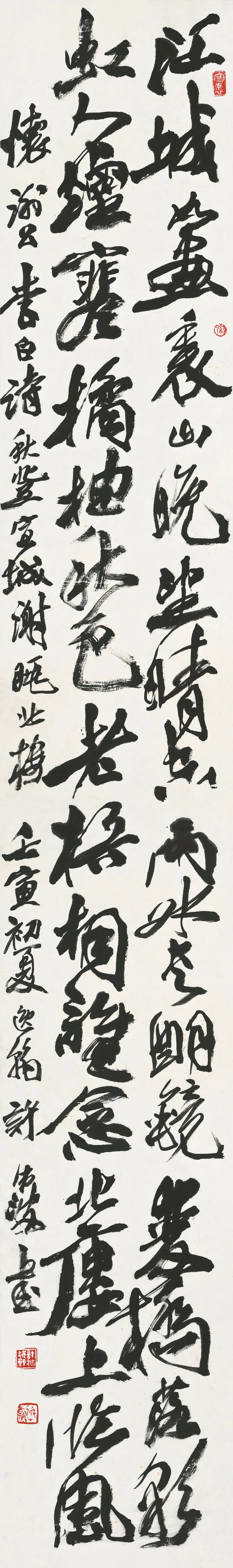 如那幅丈二大条幅书李白的《秋登宣城谢朓北楼》,挥腕直下,气韵苍古,腕力雄劲,继而一气呵成,高达丈余的白宣纸,笔力深透,结体雄浑,气势奔放,清劲潇洒,如行云流水,诗情笔意,浑然一体,给人以荡魂慑魄的艺术感受。
