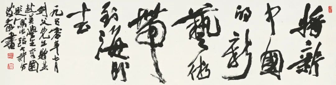 进馆迎面便见中间展柜里一幅横批,上书:“将新中国的新艺术帶到海外去。”落款“一九五零年七月剑父先生赠其赴美学生李园题写此语,今许沛波敬书。”磅礴气势扑面而来,只见其回环驰骋,恣肆奔突的点画线条,透出纵横挥斥的一股豪情。