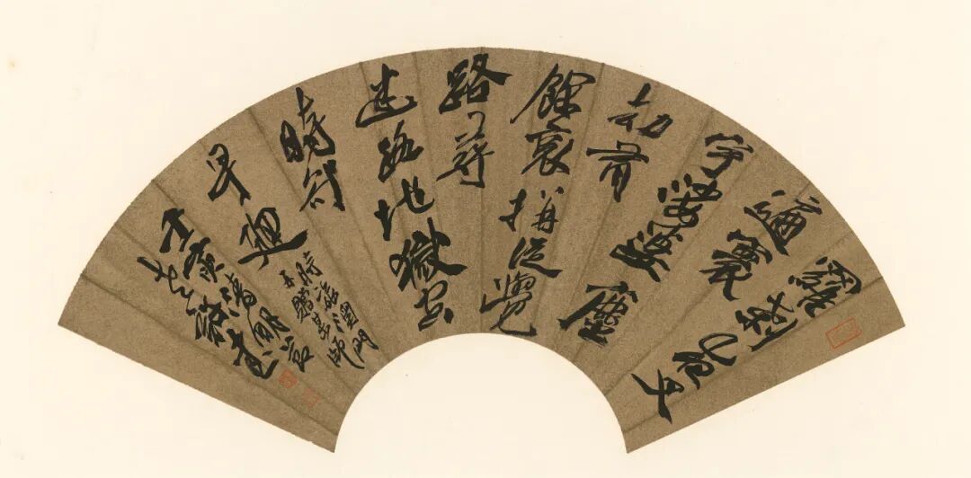 在沛波书于扇面的高剑父诗作中,可以看到他对自述各家的陶冶再造,洒落自得,天趣横生。是从倾心学米芾的精妙超逸,到明、清、近代诸家的方、厚、拙、重的审美融合。沛波行书尽量减弱短线出现,惯用大草的短点和长线来造形取势,掺以篆籀质朴之意入书,故作品显得大气磅礴,张力十足而真力弥满、激情四射。