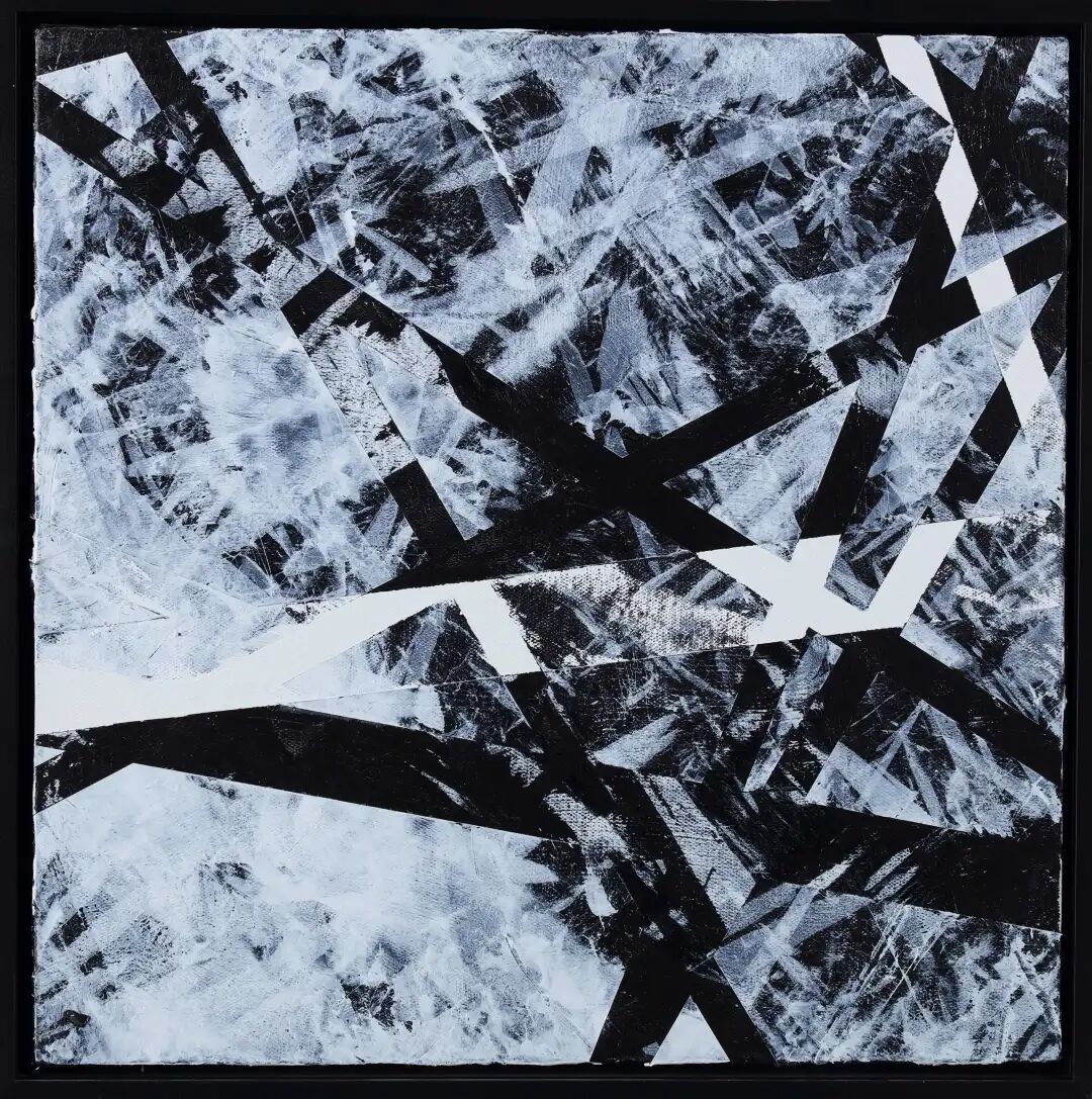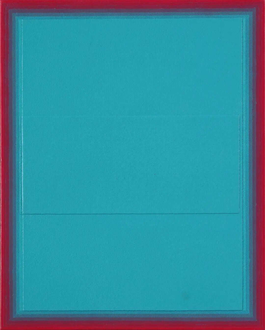 ”通过对材质厚薄的层层运用,我在逐层变厚的重复动作下会陷入一种近乎冥想的创作状态,并渐渐清晰出一个基于我个人对极简硬边的美学感受。体验到一种苛求完美的、机械的,似乎工业化制成品方式制作出来的由薄到厚的颜料层。2018年,我开始重点实践同一色块下的再分割,随之产生了《限框-实在》系列。“