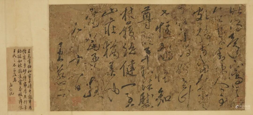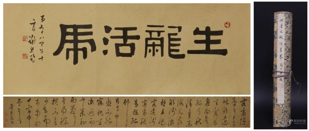 本体全长约700cm,宽约29cm;镜心全长约224cm,宽约27cm王慈南朝原本2帖长约23cm,宽约23.2cm;长约24cm,宽约45cm2.王羲之(303-361年)袁生帖唐双钩廓填摹本6.孔修·弘度·贾似道·鹅湖住山德訚·赵孟頫·李倜·王世贞(王元美)题跋7.收藏印93方,年代最近一方盖印为王铨(天启二年进士)本次上拍的这件六朝四王行草帖手卷就来自慈照寺旧藏。此品集合王廙、王羲之、王洽和王慈四位书法大家的墨宝,历经宋朝画家米友仁的鉴定,且具有收藏印93方,十分珍贵。尺寸:上口径约10.5cm,底径约13.3cm,高约30cm,幅宽约16.5cm说明:寺崎家旧藏昭和二年京都福村祥云堂领收书附 日本原箱附 全品无修器物版块则囊括瓷器、玉器、钱币、茶香道具和文房清玩等多门类精品。焦点拍品为一件南宋 凤耳龙泉瓶,出自寺崎家旧藏,并附有昭和二年京都福村祥云堂的发票。此品釉面厚重,呈粉青色,整体秀净素雅,为典型的“砧青瓷”精品。Lot 0087 元代 倪瓒临江游憩图乾隆御览之宝