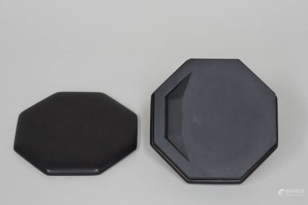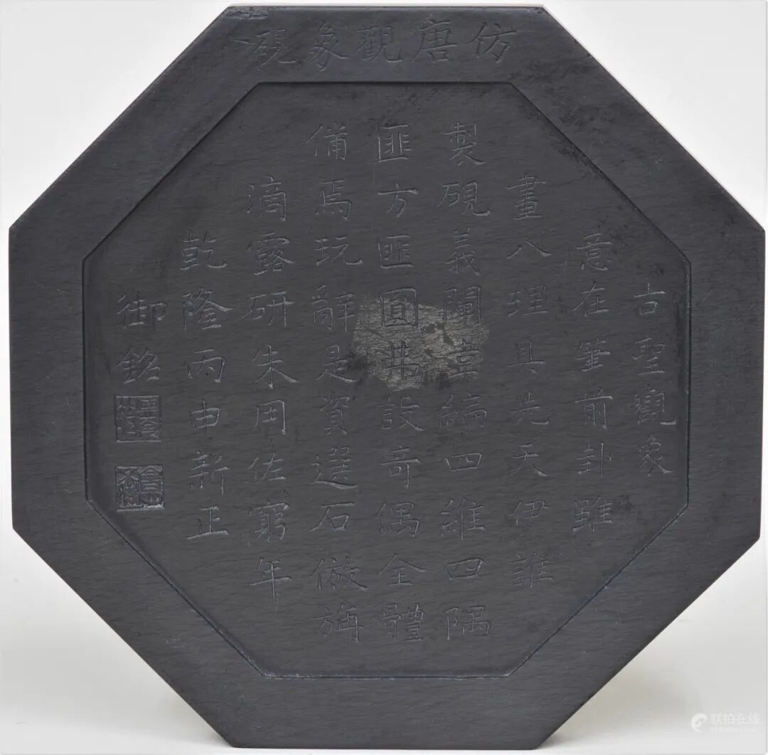 尺寸:高约33.7cm,宽约23cm,底宽约17.6cm,纵约15.3cm,含托高37.8cm拍品尺寸:本体高约6.7cm,长约19.5cm,宽约12.2cm,含托高约8.5cm,玉重约1950g尺寸:长约6.5cm,宽约4.5cm,厚约1.5cm,重约62.5g尺寸:上口径约7cm,底径约9.5cm,高约15.2cm,宽约17cmLot 405 清乾隆 歙州 乾隆丙申年御题仿唐觀象砚