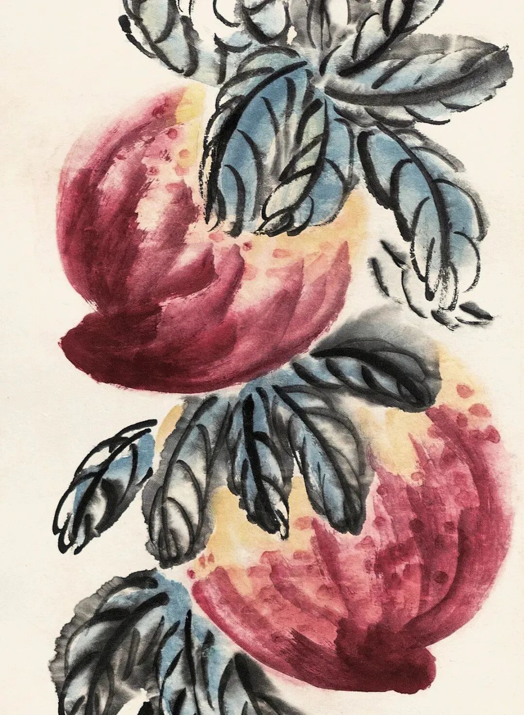 桃子的形体略作夸张,果实厚硕,呈现出强烈的视觉冲击力,用以凸显主题,渲染吉祥气氛。错落有致,形态多变的桃叶有力地衬托了桃实,给画面带来生意和形式美。