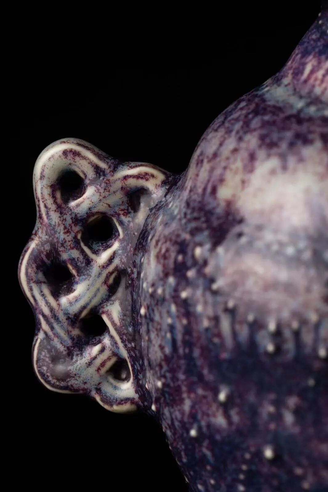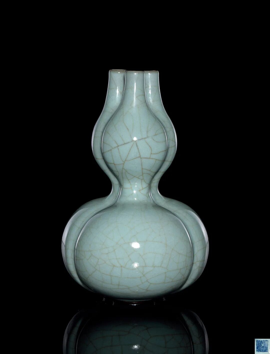 这件葫芦瓶充分展现结合了清代皇帝对宋代颜色釉美学的追慕,器物内外施以仿官粉青釉,於素雅的青绿之中泛起一抹淡紫,其质如玉,其釉光润,色调柔和而迷人,黑色胎体的铁色冰裂片纹贯彻全身,体现出宋代官窑那种紫色口铁足的效果。