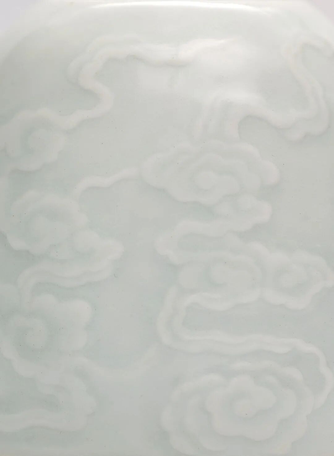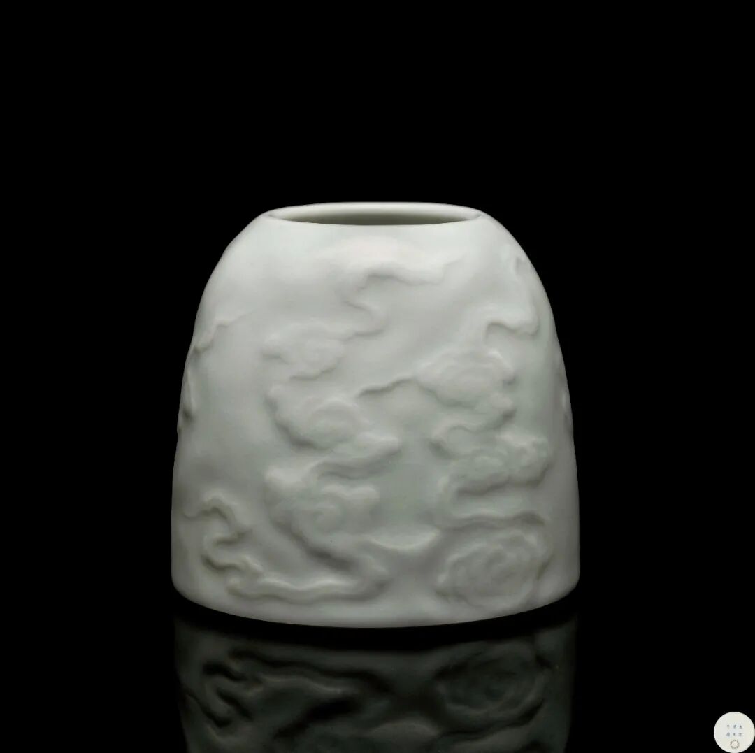 此外本次拍品的单色釉文房具还有一康熙白釉刻云纹马蹄尊,本品外壁深刻云纹,暗花清晰 ,剔刻圆润,形象饱满飘逸。底青花书「大清康熙年制」六字三行楷书款。当中工匠巧妙利用白釉的不透明度结合素胎表面的刻画,胎体上白釉因此厚薄不同,创造出别具特色的立体感,此款马蹄尊又名“马蹄水丞”,为宫廷文房,器形小巧规整,放置于案几上赏玩,远观白釉肃穆,饱满敦厚;近看烟云缭绕,飘逸富有动感,精致文雅,且易令人心思宁静澄澈。康熙类似作品所见以豆青为多,如此件白釉则颇为罕见,更添素雅。