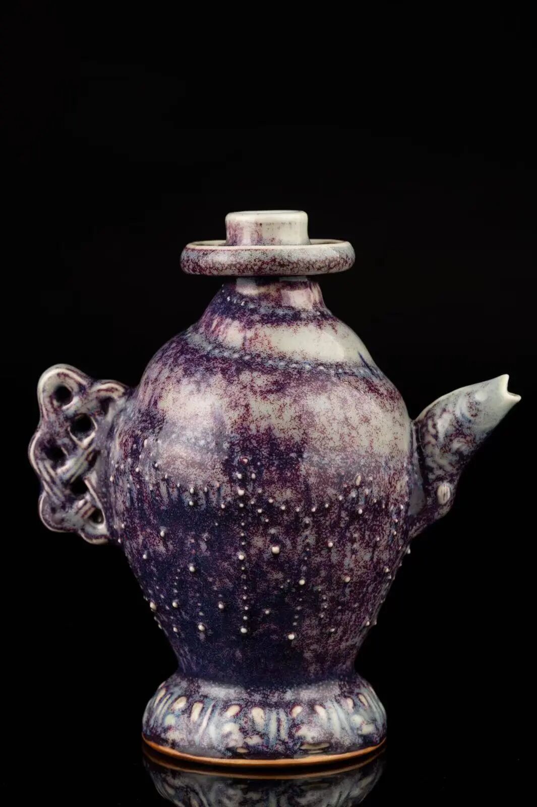 本品造型极其罕见,水注壶身灵感源自海螺,壶口形如将要跃出水面的鲤鱼,把手成绳结状,而且此壶还具浓厚的佛教特色,底座为佛造像中常见的莲花座,顶部围绕口沿有一圈形如法轮的装饰。