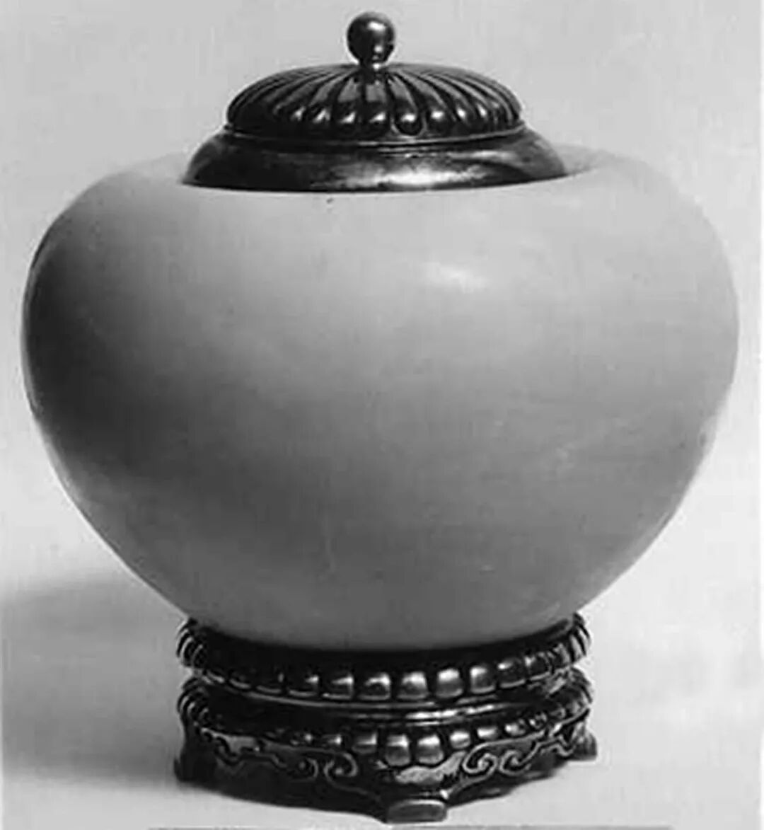 龙泉窑是中国历史上的一个名窑,它开创于三国两晋,结束于清代,生产瓷器的历史长达1600多年,是中国制瓷历史上最长的一个瓷窑系,龙泉窑位于龙 泉县,以大窑为中心,烧造之器多为文绅、显贵及朝廷所用,质精雅致,尤以胎质、 造形、做工为尚。 龙泉瓷匠致力精进工艺,以臻完美,制器过程,不论炼土、塑形、 施釉、烧造,处处精确娴熟,成品典雅隽美,釉色青丽,亮泽如玉,一如本品。 本品造型珍罕少见,恢宏大气,折沿深腹,外壁雕饰上下相错的两重折枝莲花纹, 莲花朵朵,妍美盛放,富具三维效果,布局繁密有序,刀工流畅娴熟,一展莲花挺 秀之姿,流露出明初特有的豪迈气概。 最为独特之处则见胫部雕出卷云式缸座,别 致新颖,益见典雅高贵之气。 其釉水深碧厚润,敷施于凹凸起伏的纹饰之上,铺陈 出一番有别传统素雅含蓄的风格,凸显皇家雍容华贵之一面。 明初龙泉窑承命为朝廷烧造需用器皿,成就龙泉青瓷史上最后的辉煌,期间所出多 为大盘大碗和玉壶春瓶、执壶,大部分是用于出洋赏赐海外国家,一部分具有本国 传统特色的器皿例如本品所代表的花器则上贡至宫廷里服务于帝皇生活,成为名副 其实的御用器皿。 而且如此造型的龙泉大缸非常少见,目前可见资料当中,仅知中国 国家博物馆有类似收藏。