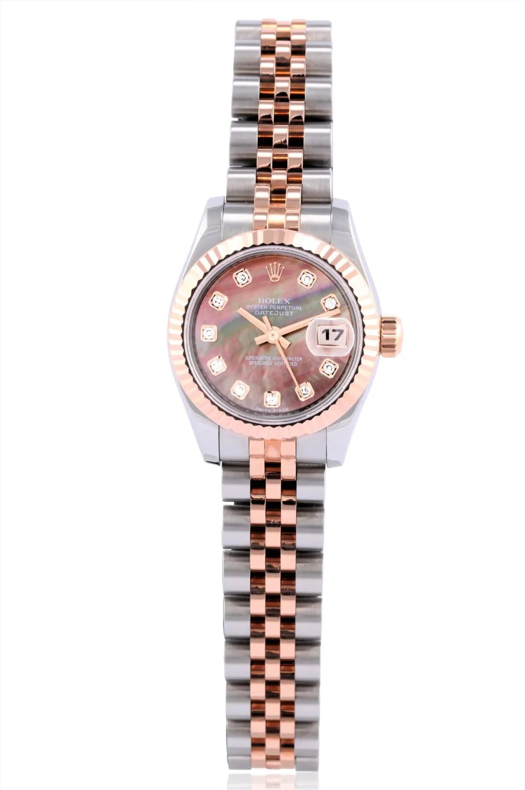 時尚,女裝玫瑰金及精鋼鑲鑽石自動鏈帶腕錶,備黑色珍珠貝母錶盤及日期顯示