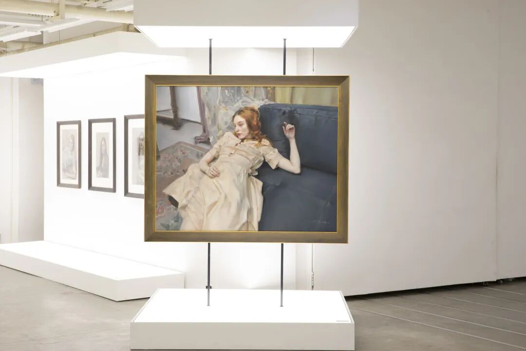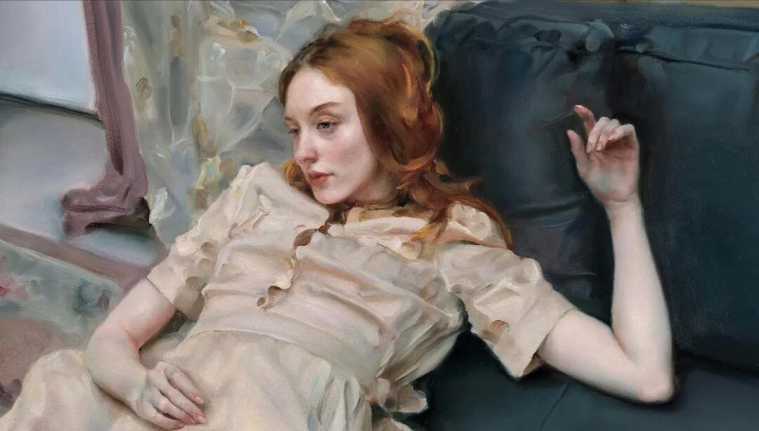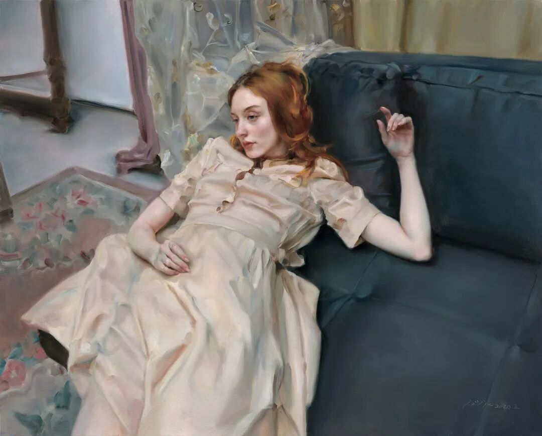 在面对《斜倚的妮娜》这件作品时,艺术家对现实的场景不做过多的交代,简化背景中的内容,摒弃过多的细节,相反,尽力捕捉人物在此情此景下的肢体与心理状态。在定格的瞬间里,他用精湛的线条、细腻的色彩和优雅的个人化绘画语言将古典的静谧气氛和当代人物的精神风貌融合在了一起, 把人物独特的内在气质诠释得恰如其分。
