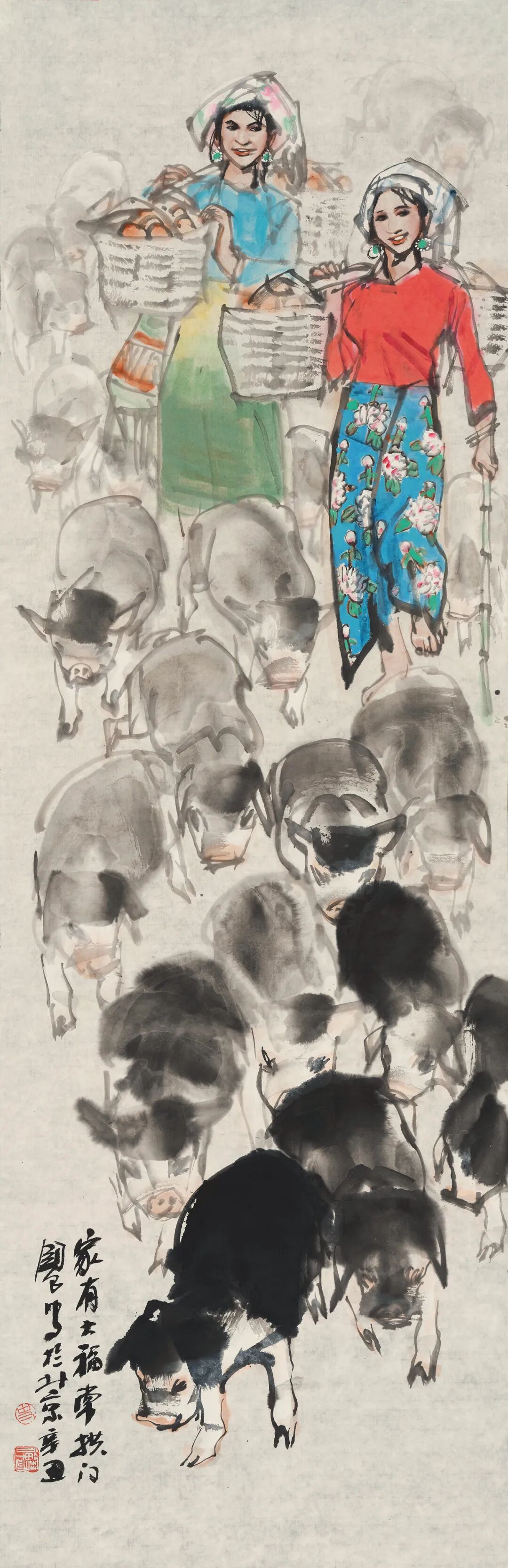 史国良先生的少数民族人物,因为其兴之所至,取象不惑,下笔麻利而痛快。犹如法国画家米勒把对乡村生活的热爱付诸笔端而使之永载史册,史国良也把自己内心一点点积累起爱的对傣家风景,当地人文的感情,以最大限度的质朴的方式表达在画面上。此幅《家有大福》,笔墨极其准确、生动、结实,但却又轻松自如,富有表现力,于恣肆放达、纵横捭阖之中,给人以于心无累的美感。赋色明丽,浓淡相宜,虚实相间的块面处理恰到好处。“猪”为六畜之首,象征有福有财,丰收时节少女的明丽和小猪们的憨态更为是幅带来极佳的寓意。