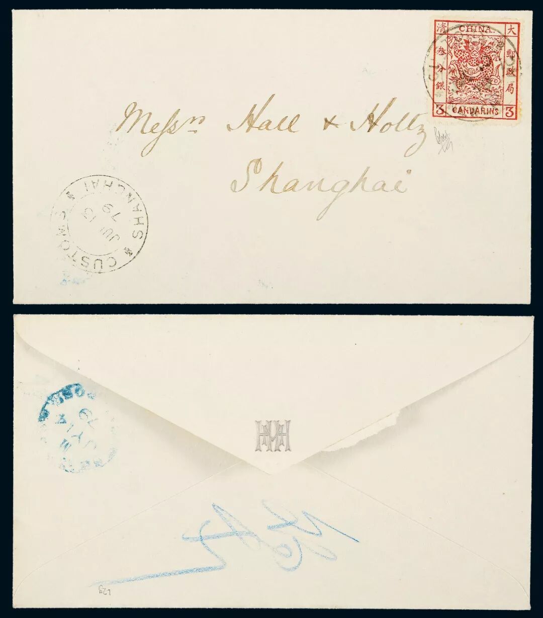 1884年牛庄寄英国西式封,背面贴厚纸大龙叁分银横三连「模号18-6-23」,销“信力已付勿索勿给”黑色长方形戳,牛庄1884年11月21日黑色海关英文戳,经上海中转盖11月26日黑色海关英文戳,法国轮船邮局12月2日戳,正贴法国25丁生邮票一枚,销上海法国客邮局11月26日戳,另有英国爱赛特1885年1月5日到达戳。此封因牛庄海关发寄漏销邮票,经上海海关以“信力已付勿索勿给”戳记代为补销。大龙信封上以此戳记补销者甚罕,存世记录仅有两件。