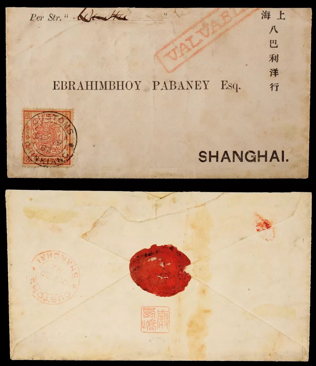 1900年汕头寄德国大龙混贴挂号封,正面贴薄纸大龙伍分银、小龙壹分银、叁分银及慈寿玖分银各一枚,销汕头1900年5月10日英汉半切小圆戳,下面盖罕见之红色长方形汕头I.P.O.挂号戳,另贴香港十先时邮票二枚,盖汕头邮局“I.P.O.”戳,销香港5月11日转口戳,背盖德国巴登巴登6月10日到达戳。此封使用时期以改用洋银面值邮票,但仍混贴大小龙及慈寿邮票,为著名毛斯之集邮品封,背盖著名大龙集邮家黄建斌收藏章,甚为罕见。