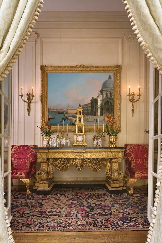 这对特色扶手椅由家具工匠威廉及约翰·林内尔(William andJohn Linnell)约于1754年制作,摆放于伯明顿庄园内的中式卧室(英国最著名的中式房间之一)。林内尔的原有设计图被保留下来,成为原有委托的珍贵记录,而套房内同样知名的睡床和另外两张扶手椅,则藏于伦敦国立维多利亚阿伯特博物院。这对扶手椅体现西方人眼中的中式家具设计,象征十八世纪欧洲人对异国事物的热爱。这对扶手椅设于盖蒂夫妇家中的客厅内,以巧妙而浪漫的方式交织出盖蒂夫人对中国的憧憬,并优雅地守候在这间美国显赫名宅的大门附近。