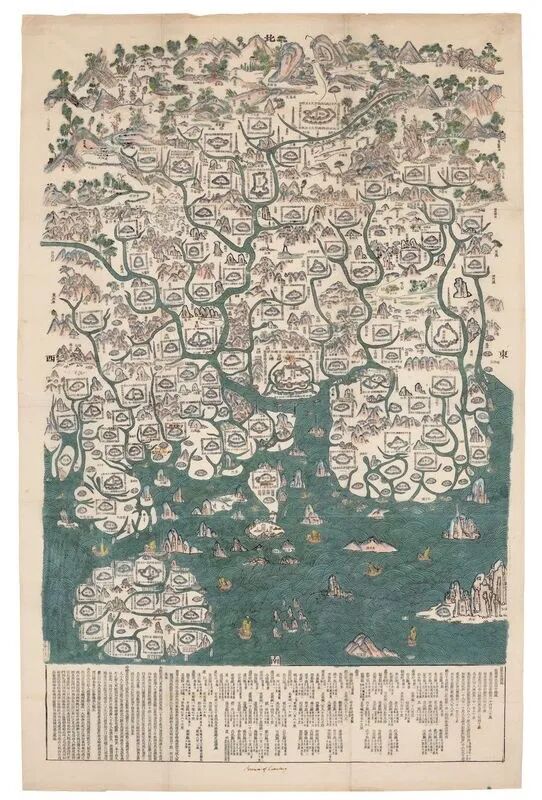 这幅独特的十八世纪珠江三角洲地图记录了早期广州港口的盛景,该港口后来发展为中国南部国际贸易中心,对接英国和葡萄牙商船。这幅地图乃受朝廷敕令而制,为新登基的乾隆皇帝用于政事之用。此地图并无加制纪录。此地图曾广泛展出,包括1974年在大英图书馆展出,也曾挂在盖蒂夫妇旧金山住所的图书馆走廊上,暗示了他们对旅行的浓厚兴趣和热爱。