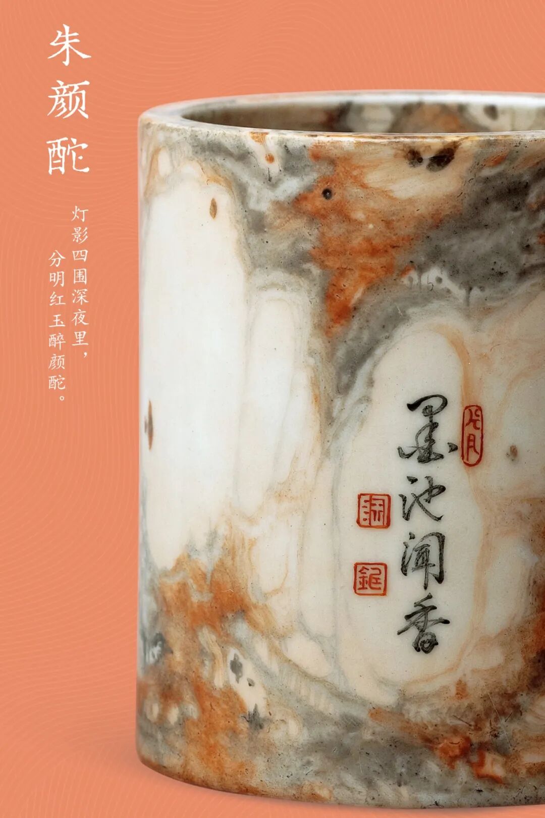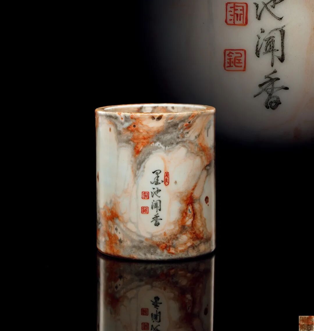清乾隆 唐英制仿石纹釉墨彩「墨池闻香」笔筒
