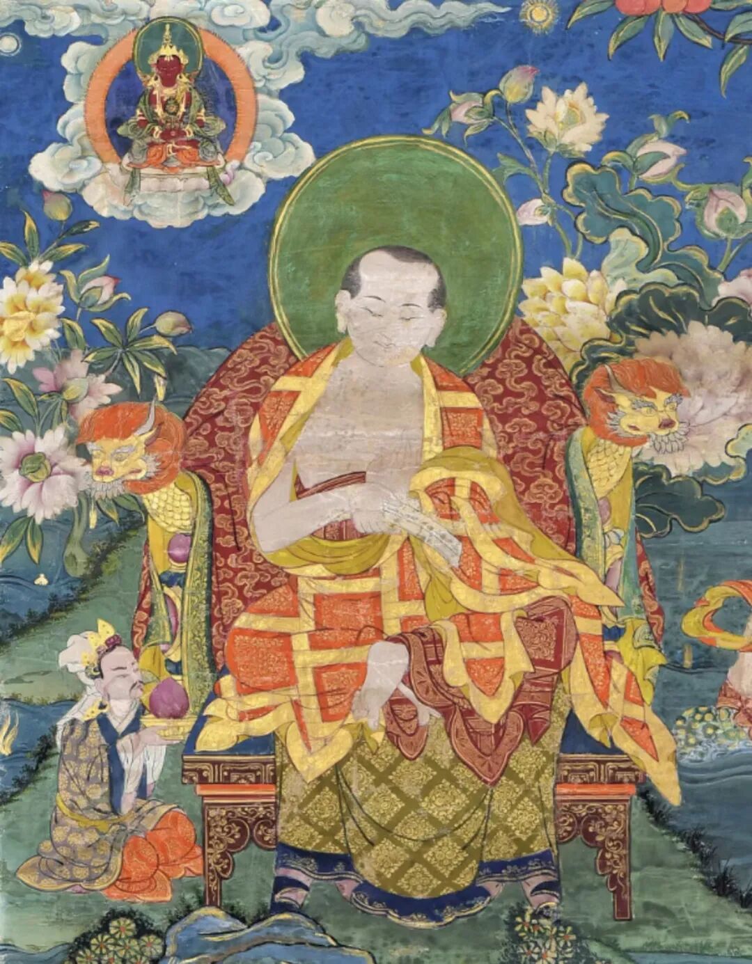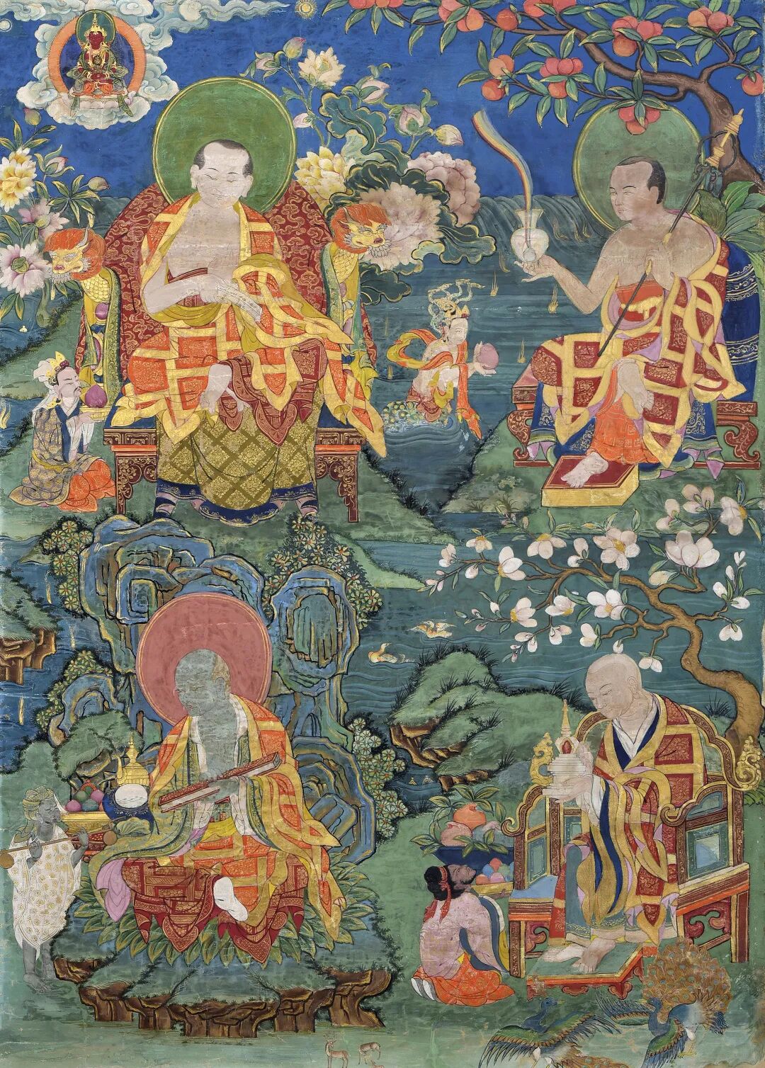 四罗汉身旁皆有弟子或侍从陪伴,增添了画面 的气氛。 画面左上角空中浮现无量寿佛像,背景以绿色山石为主,天空呈现干净的蓝色,颜色鲜亮,画风清新。 此幅唐卡主尊四位阿罗汉的绘画精细入微,细至神情亦表达得十分传神。 着红 色袈裟,身姿自在安然,彰显了精神内涵,在每位罗汉的艺术表现中,采用了差异化手法 ,以 青绿山水 、繁复宝座 、不同颜色云团等艺术元素将其自然分开,整体融合的画风中中又有所区别,体现了每位尊者不同的特质。 画面以青绿山巒为背景,绘画传神,线条流畅精细。 整幅画面一气呵成,布局合理,画面协调,画工精巧,设色和谐,生动的佛教故事场景跃然眼前。