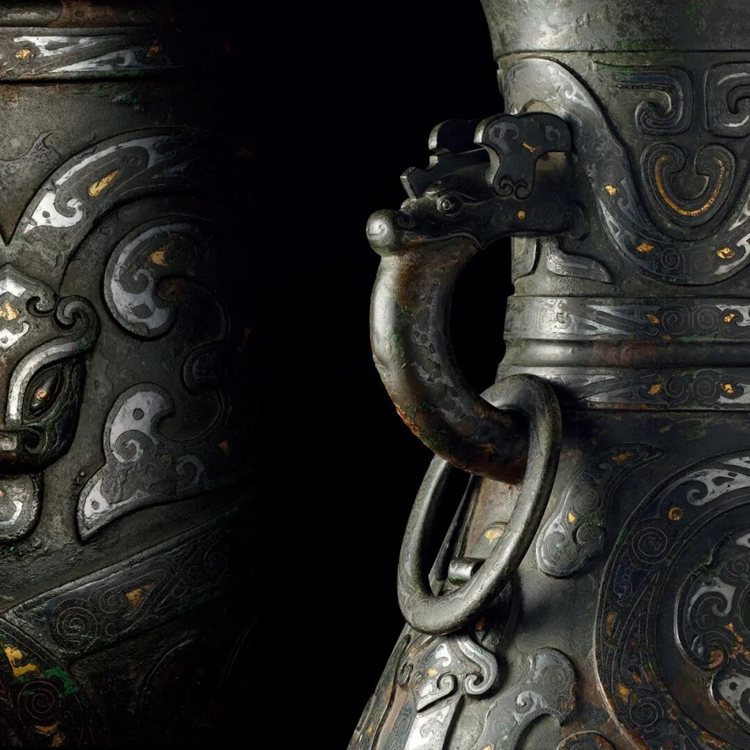 此拍品明铜错金银蟠龙纹双耳尊,器口、颈、腹部均为椭圆形。口沿外撇,厚唇;颈部收敛,两侧置兽首衔环耳;溜肩,鼓腹并下垂,圈足厚高且外撇;整体布三层紋饰,颈部饰波曲纹;纹内饰斜角云纹,腹部饰蛟龙纹,双龙错身缠腰;周身亦饰有云纹为衬,龙身亦布满斜角云纹;高足中饰曲波紋一周,纹饰之间以弦纹带隔开。其器之颈部,腹部,足部及环耳皆以金银镶错出纹饰,彰显贵意。