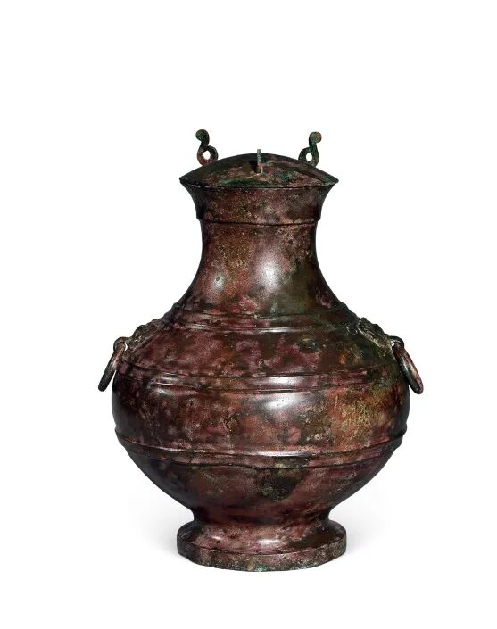 此壶为一对 ,口微敞 ,束颈鼓腹 ,高圈足 ; 有盖 , 盖上立三个等距简化的凤鸟形钮。 汉代时期青铜 壶壶腹承袭战国遗风,最大径上移至壶中部,腹侧多流行装饰铺首衔环耳,并饰凸弦纹,这些特征皆可见于此对青铜壶。 同类器型可参考河北省文物研究所藏的战国 圆壶 与西汉中期甄氏壶。