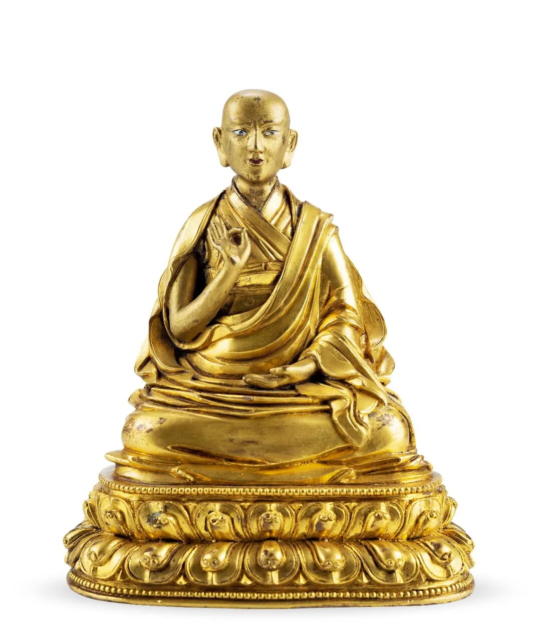 上师是具有渊博学识和高深修为之人,在密教修行中,僧侣信徒都要皈依上师 进行修行,因此上师是藏民族心中的精神导师,其地位和修为被视为与佛、菩萨无别 ,具有极为重要的宗教地位 。 此尊上师像造型舒展 ,人物形象生动 ,金色 亮丽。 面相方圆,额际高广,眉目和善,唇部微露笑意,形象生动写实。 上躯端正, 僧衣衣纹质地厚重,线条自然流畅。 右手当胸结说法印,结全跏趺坐于双层莲座 之上,莲瓣细长饱满,做工精致,金水饱满,值得珍藏。