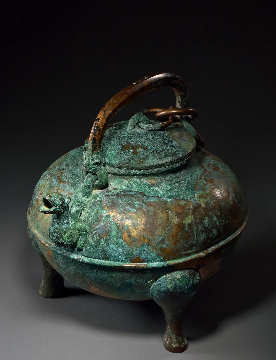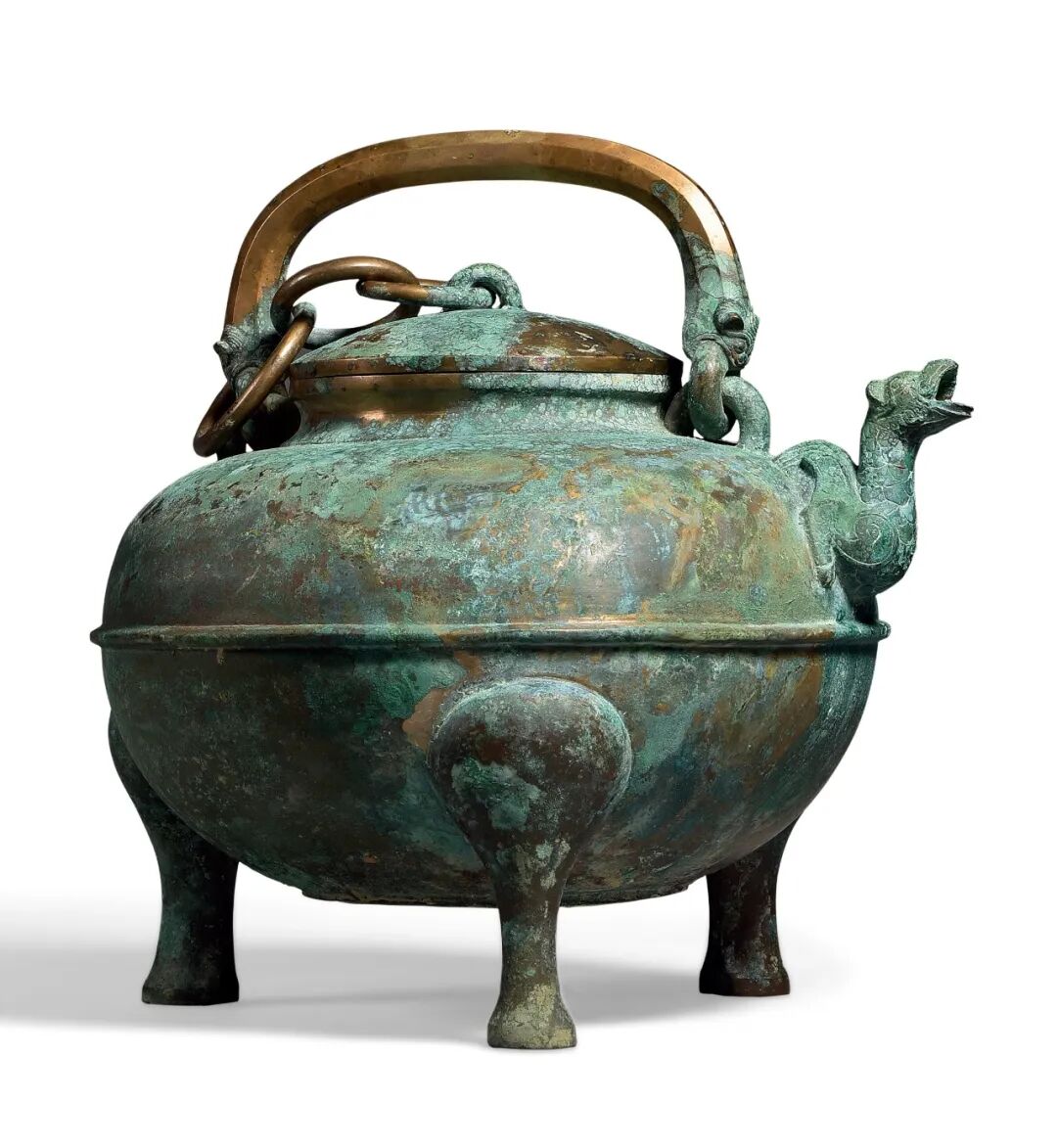 此盉口沿外侈 ,口上有一圆盖,周围饰弦纹。 广肩,鼓腹,腹部饱满而秀美,饰弦纹一周,三兽足。 流较长,龙首微昂,张嘴为流。 腹部一侧置半环形龙 首 鋬,龙首向外,既可把持,又美观雅致。 盖侧铸有活动链环与鋬相连。 铜盉出现在商代早期,盛行于商晚期至西周,主要作用是盛玄酒(水)以调和酒味浓淡的,与爵配套可以盛酒,与盆配套亦可盛水,常用于贵族祭祀、宴飨等礼仪性场合。 整个器物造型独特,铸制考究,铜绿斑驳,古朴典雅。