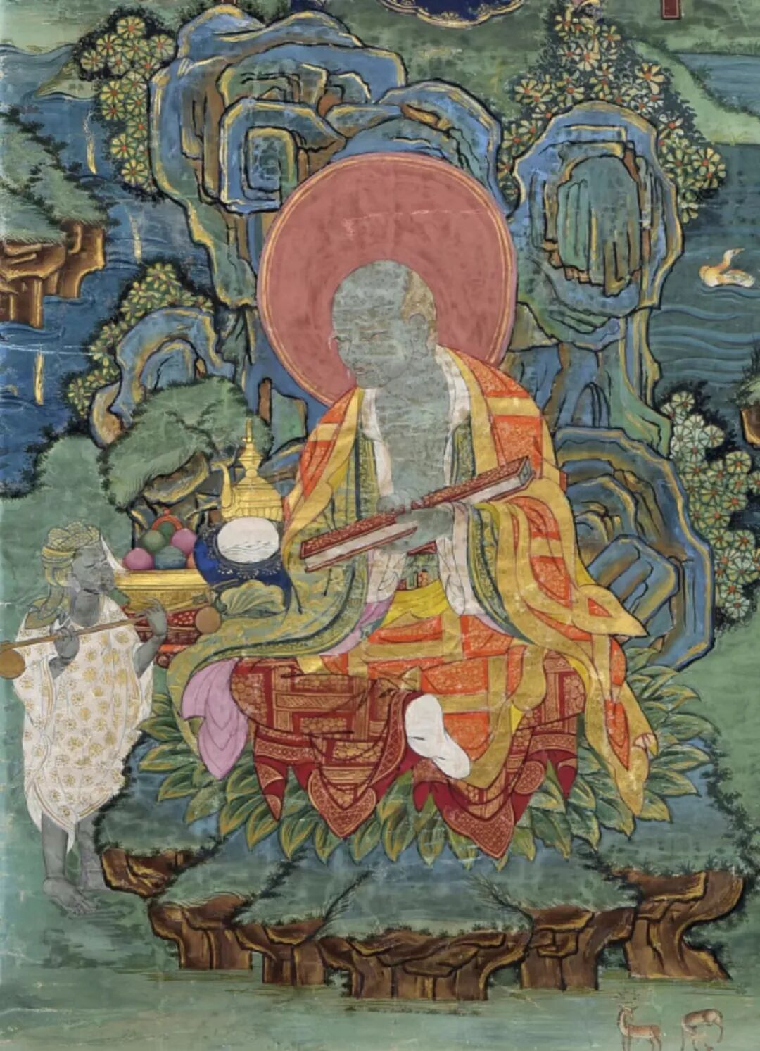 此幅所绘即为十六罗汉中的四位罗汉。 四位罗汉分上下两排,皆端坐于坐垫之上,身披袒右肩袈裟和僧裙,形态各异,手持不同的法器或结不同印契,显示 各自不同的宗教功用与身份。