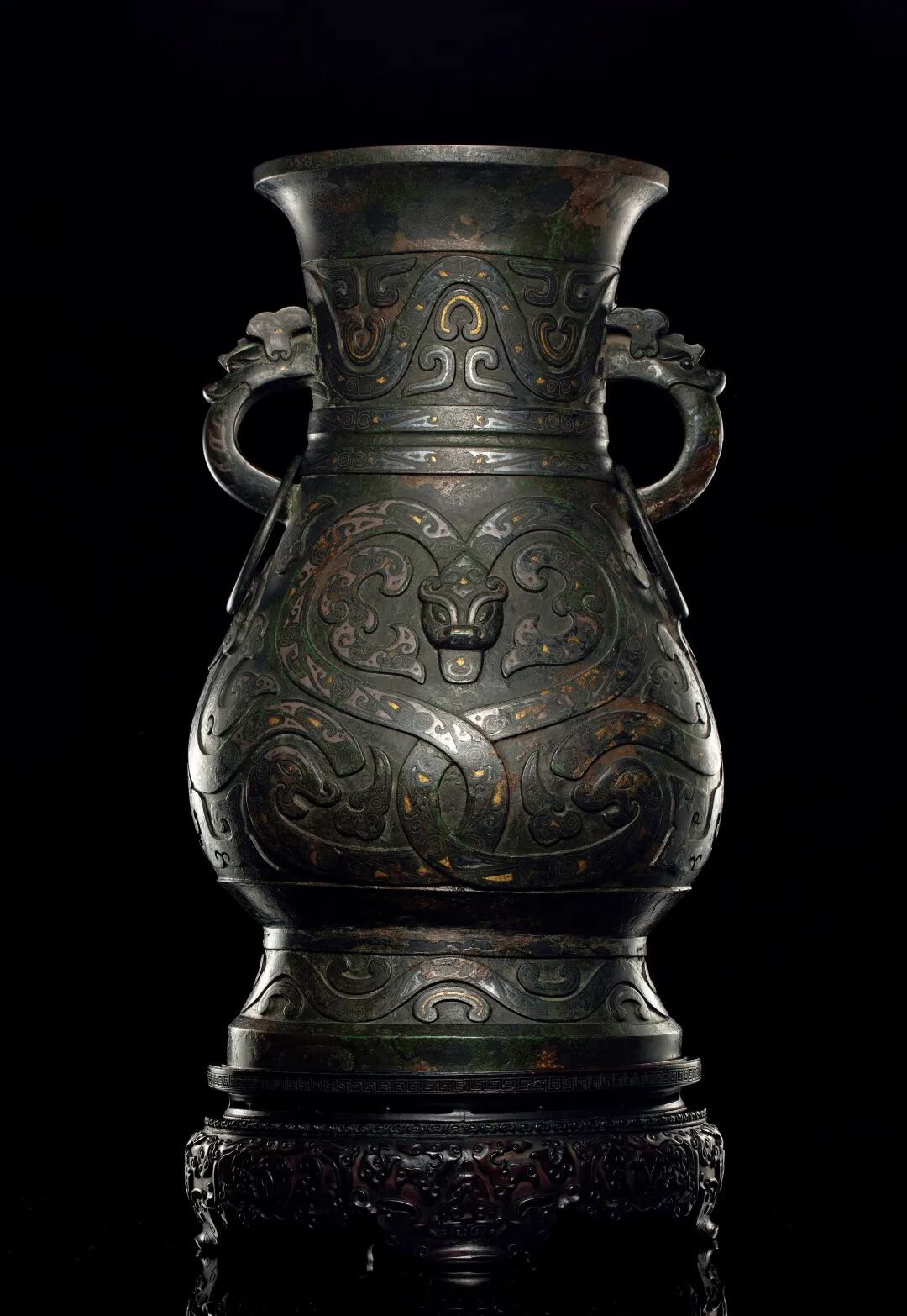 明铜错金银蟠龙纹双耳尊(配座)