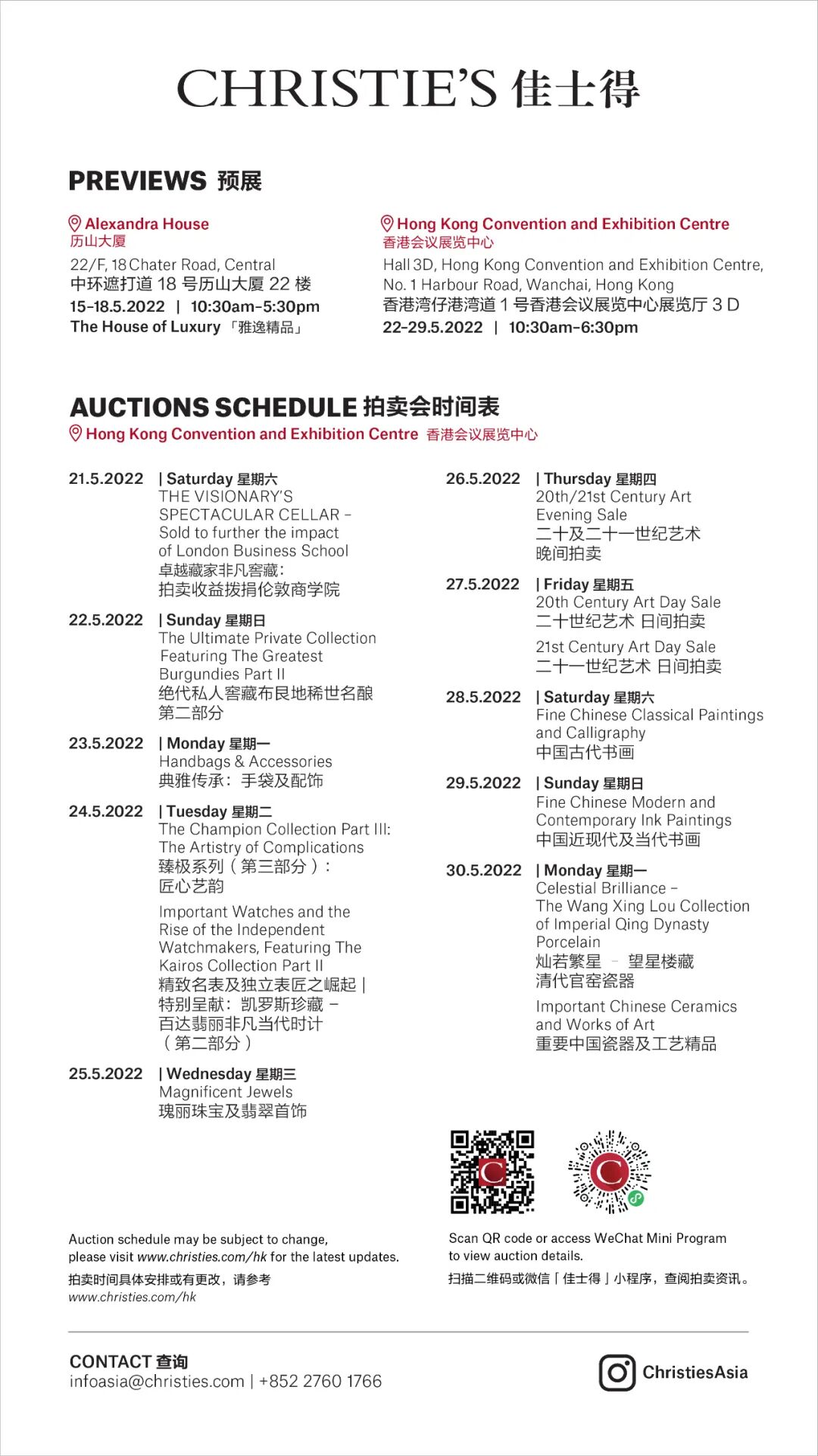 此次香港春拍的所有拍卖均将进行现场直播,您可以通过下图中的二维码预约注册观看各场次拍卖直播。