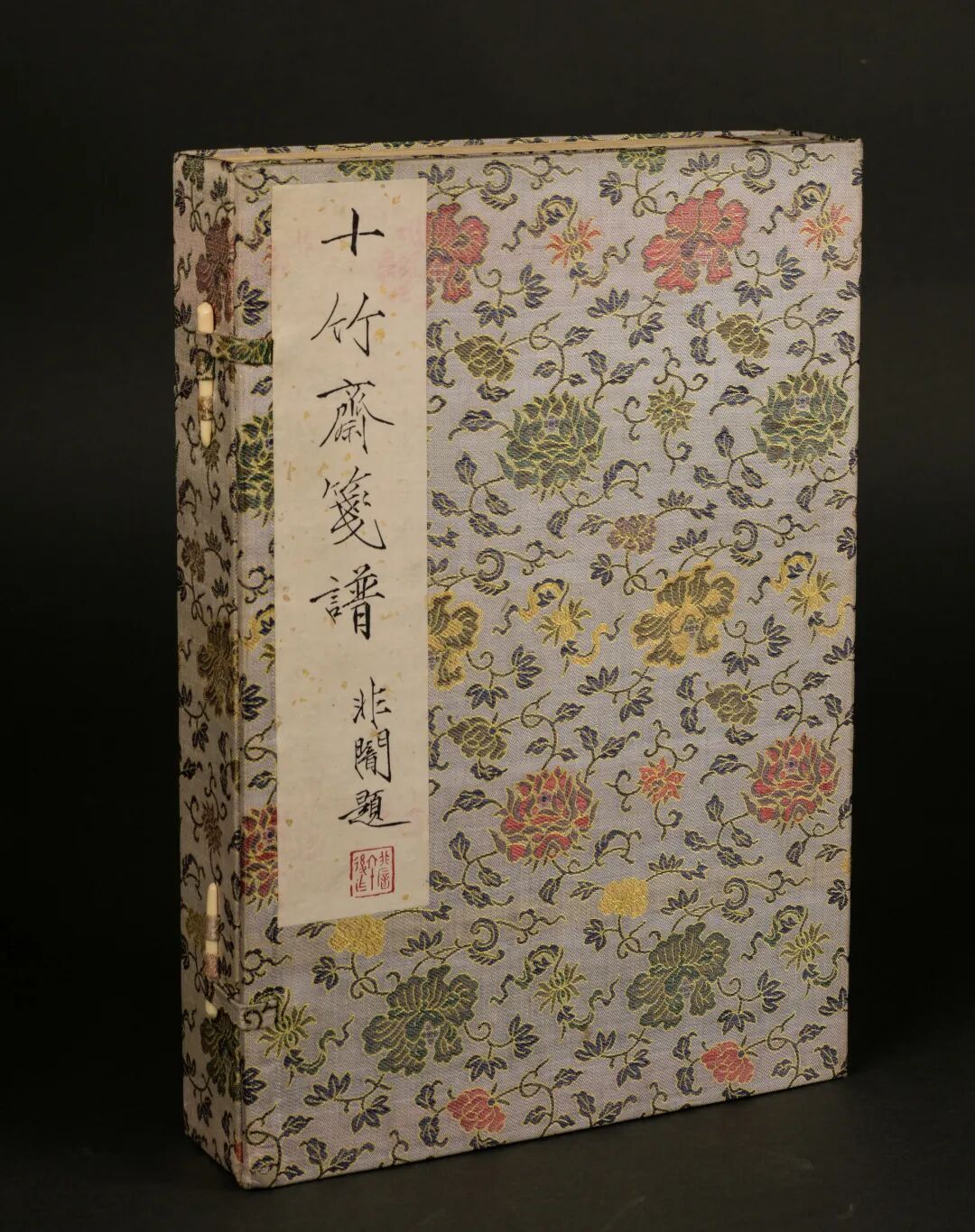31.2×21cm 明代《十竹斋笺谱》堪称饾版拱花笺谱中至精者,民国郑振铎于北平王孝慈处偶得一部,盖据此底本,与鲁迅共商,于1930年假得付荣宝斋重刻,后新记再版,郑氏又以淮上新获之本补足前刻之阕,终合全帙。即为此本。本书前有郑振铎1952年序,后有郑振铎1930年跋,于非闇题签,织锦函套,函套内有1952年版权页。