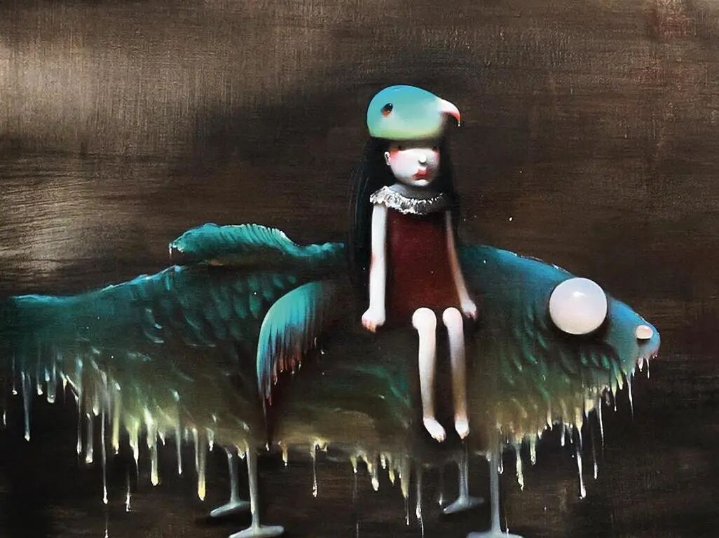 小女孩是陈可早期作品中的标志性形象,圆圆的鼻子,单眼皮的眼睛总是透着默默的忧伤,颊上两坨绯红,透着天真的情绪,可是印在略显的苍白的脸上,会让人不经意想起意大利导演Alberto Sironi的《木偶奇遇记》,像是一出舞台剧的场景排布。陪伴女孩的是一条有翅膀的鱼与一顶鸟头形状的帽子,这些超现实元素极富魔幻色彩,既表现了女孩的梦想与渴望,也呈现了她的敏感与孤独。通过描绘小女孩的表情和状态,陈可把毕业后她初到北京,初入社会的这份孤独、梦想,以及对周围年轻人的观察都揉进了画里。稚气可爱的小女孩却表现出来一种伤感的气息,这似乎也是陈可内心的写照,正如艺术家所说“其实我觉得我在画的过程里面,也在不断找自己的内心,因为我的作品是和自己的内心有关系的,我越来越发现,人的性格有很多面,有很深的东西”。陈可将她在社会环境中面对多重现实的压迫下人生起伏过程中个人的私密情感诉诸画笔,以其个体经验和主观情感为切入点,不仅仅满足画面本身带来的视觉愉悦和创造力,更以娓娓道来的表述方式诉说着年轻人成长中的快乐与苦涩,唤起人们记忆深处不可言状的感怀,打动人心。