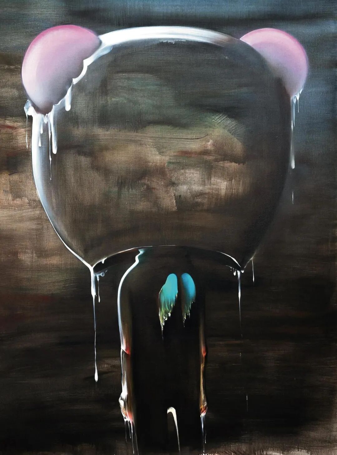 更值得一提是,正如《英雄归来》这个作品名所示,艺术家通过构图将叙事与场面平衡化处理,在超现实变形的尘霾中,背对观众的头套勇士遥看着乘鱼少女,类似电影视角的对视与英雄主义精神产生了深刻交织。小女孩在面对庞大的未知世事时虽然感知寂寞,但内心仍保持不惧不畏的孤勇,直面现实,一往无前,疏离中自有力量感。艺术家赋予小女孩生命,与女孩对视的的或许正是自身精神投射出的巨大背影,象征着在孤独与挣扎中最珍贵的坚持。其自我意识的投射不经提供了珍贵的作为女性艺术家的个人叙事视角,同时激励我们每个人在焦虑人格与游荡精神的矛盾中都可以更勇敢,不被世俗的某些标准所压迫或诱惑。在人类的所有美德中,“勇敢”是最稀缺的。从梦幻到平静,从虚拟回到现实,她从自己画中的平行世界,确定了自己喜欢、想要获得的女性力量——不是威胁,不是对抗,很多时候就是一种内心的坚持,坚韧。