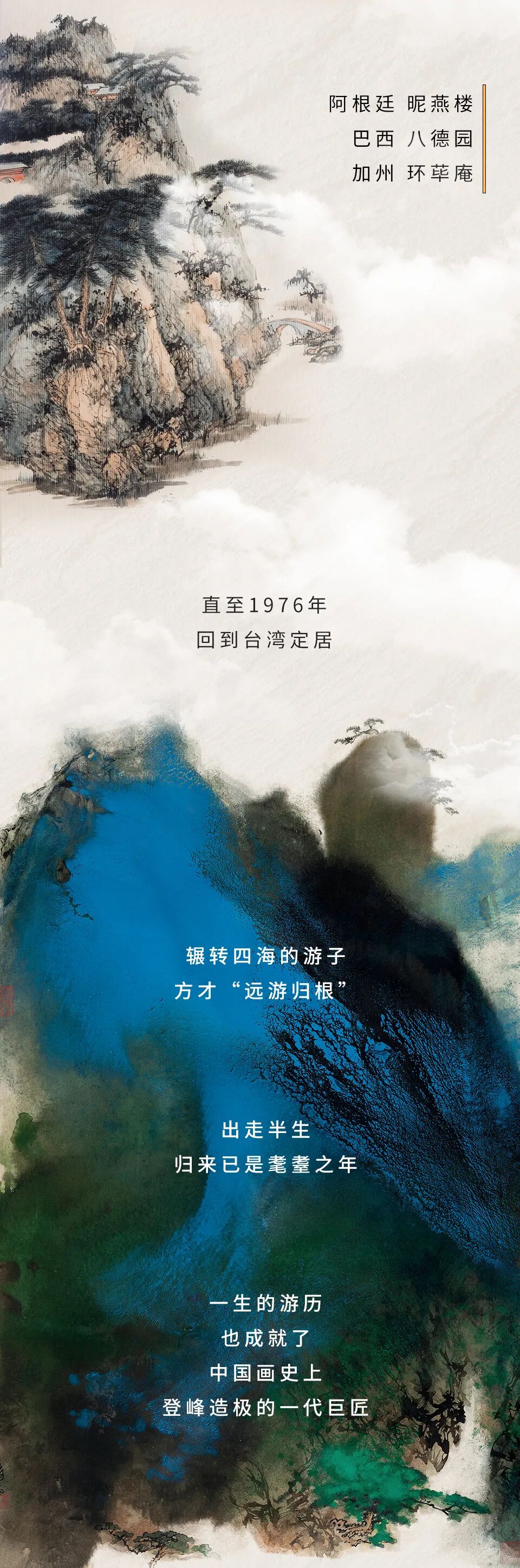 二十世纪五十年代后期至六十年代,万里寻胜的张大千终觅得桃源迁居八德园,曾题诗云:“亦无烟瘴亦无尘,鸡犬桑麻亦有邻。万里投荒差自喜,离难仍作太平人”。从诗中可见大千先生此时对于生活恬然自得之感,其艺术创作亦渐至高峰。
