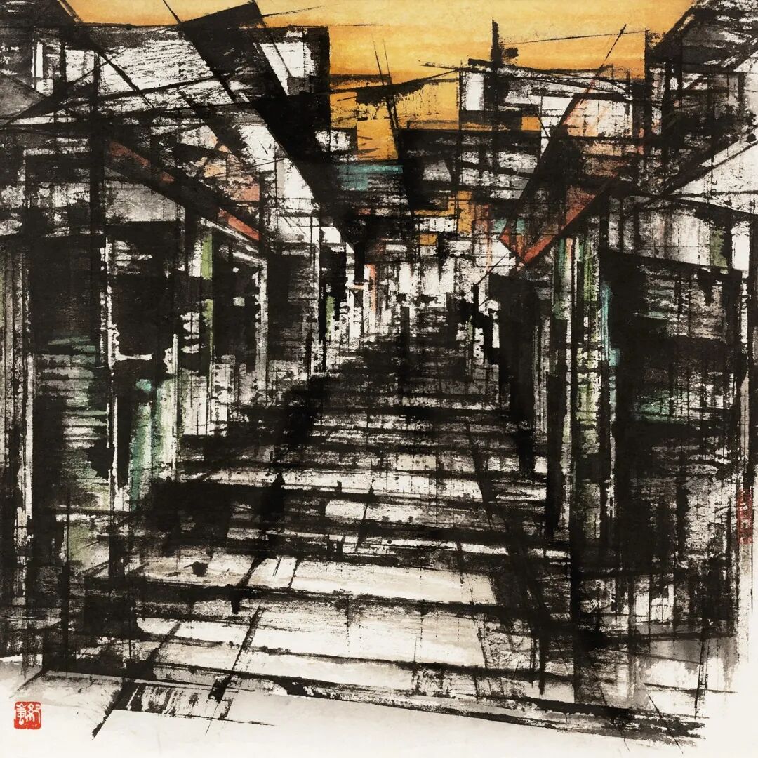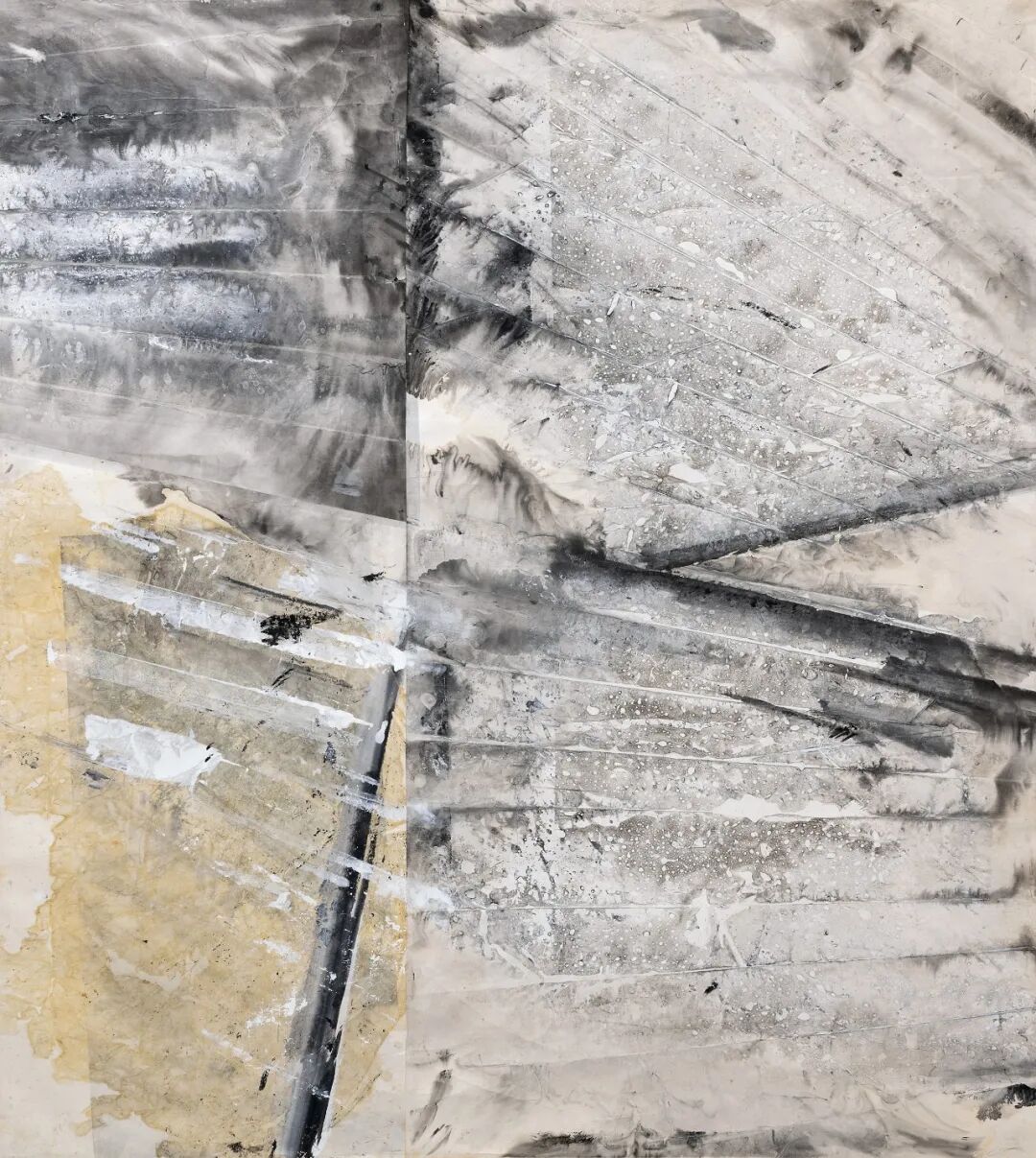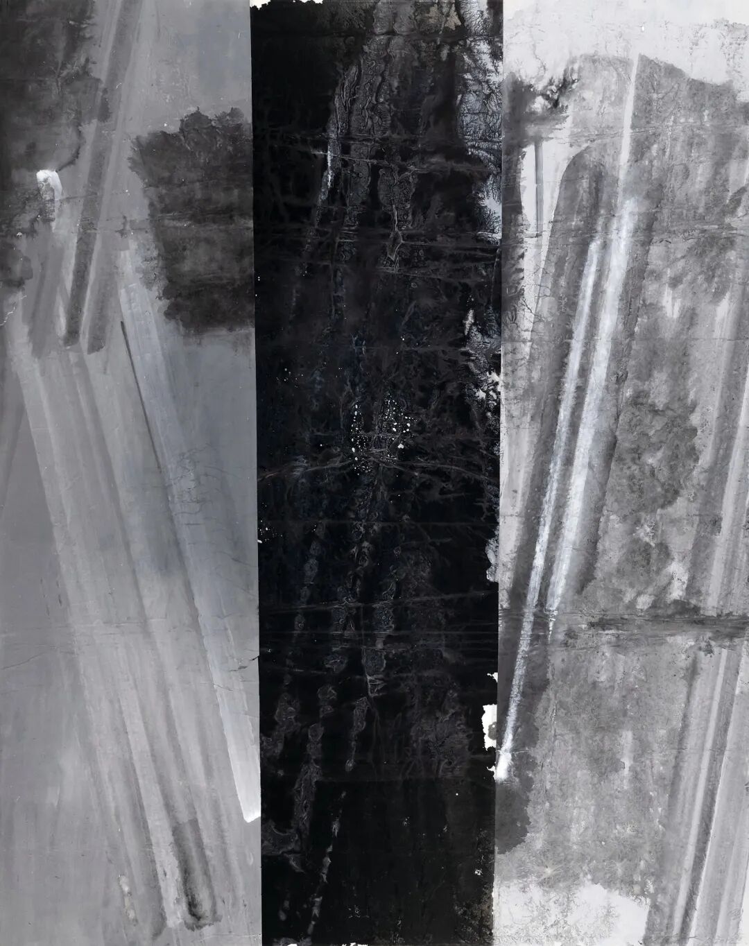 起初我用丙烯是纯粹从材料的角度去考虑,想除了水墨外再增加某种直接的材质感和多类层次。丙烯与墨的效果让我感觉到了某种水墨语言。一白一黑,十分简洁,两者又相互生发。墨色本身形成的层次感所带来的空间不同于丙烯的介入所产生的元素。比较传统技法以墨色层次的浓淡干湿来体现空间,一上丙烯就多了一层物体,一层丙烯与墨相结合的空间感……起到的形态结构和空间层面深度,其效果是仅以水墨所无法取得的。