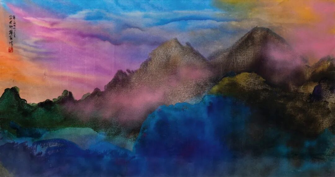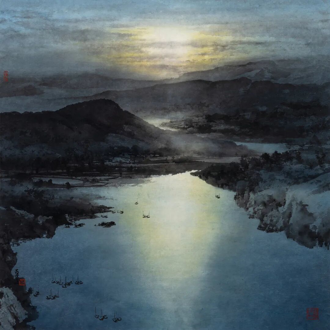 《曦望》正是彩墨相融的“何家山水”的典型代表作,水墨纵横,色彩绚丽,气象万千。在由近及远的海湾笼罩在晨曦的阳光中,山脉用传统山水画的方式以水墨描绘,晨光则带有西画立体感,为画面塑造出更真实的空间感,云霭之间,自然山水的气氛扑面而来,已经出海的和依然泊在岸边的小船则为这宁静的晨曦增加更多灵动。自然造化之景,变幻无穷的生命力,以及传统文化的情怀,都被何百里描绘在这方寸之间。