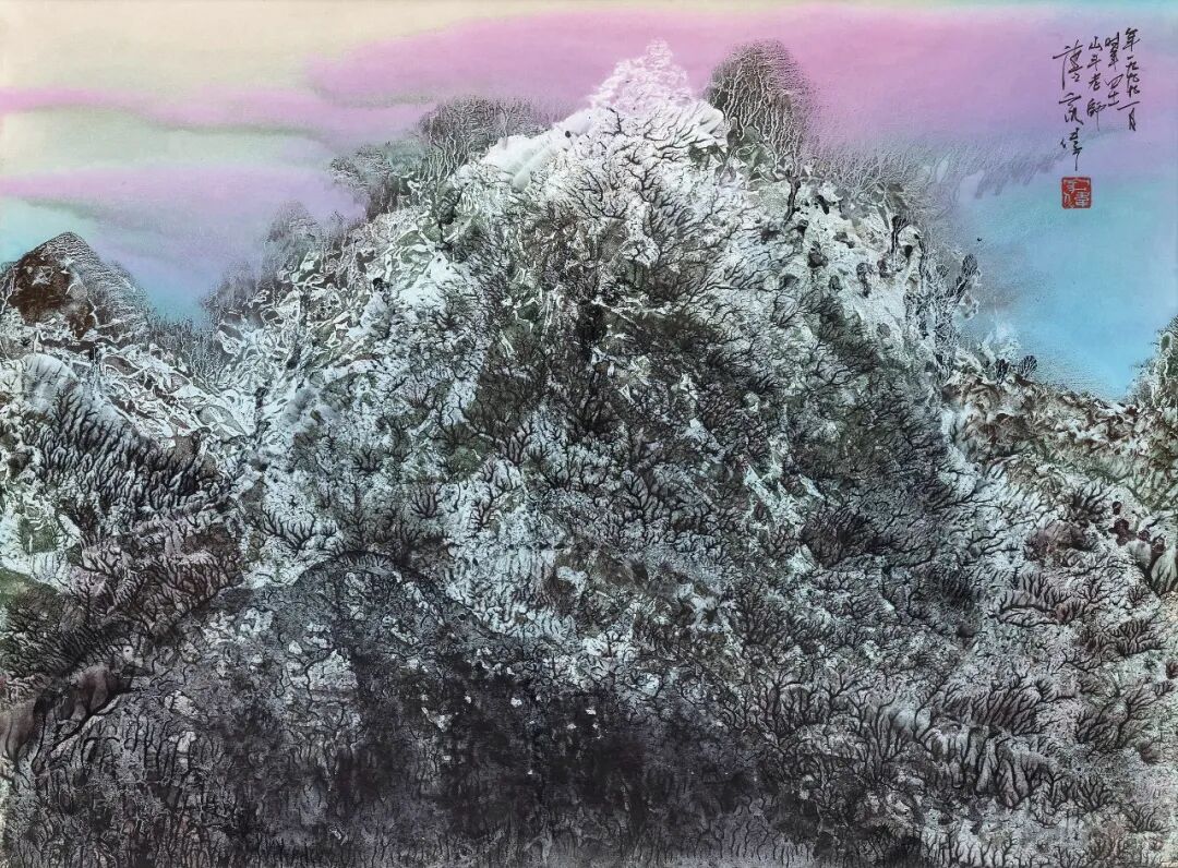 本次香港春拍的两件“天界”系列作品,是唐家伟山水画的典型作品。淡墨痕迹结合明亮的石青、石绿传达出明亮和华彩,有着无须着力的自然性。《天界 (No.311)》中,既有着张大千彩墨绘画的神韵,亦隐约可见米家烟雨的底色。《天界 (No.35)》中借用了大量传统绘画中的皴法,来表现不同的水拓石纹图案,从岩石的裂缝到山谷的凹陷,形象而又抽离。
