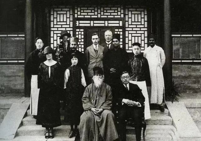 1921年,罗素应讲学社之邀来到中国。罗素(右一)与赵元任(左二)在院中合影。