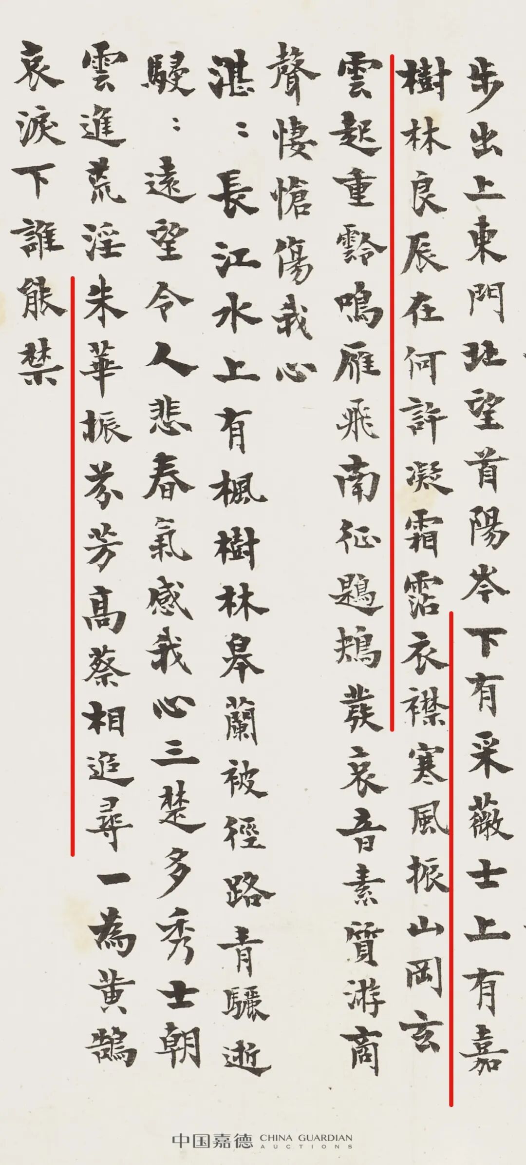 释文:步出上东门,北望首阳岑。下有采薇士,上有嘉树林。良辰在何许,凝霜沾衣襟。寒风振山冈,玄云起重阴。鸣雁飞南征,鶗鴂发哀音。素质游商声,凄怆伤我心。湛湛长江水,上有枫树林。皋兰被径路,青骊逝骎骎。远望令人悲,春气感我心。三楚多秀士,朝云进荒淫。朱华振芬芳,高蔡相追寻。一为黄鹄哀,泪下谁能禁。