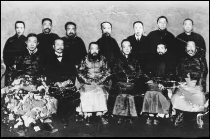 清华大学导师团:梁启超(前排右二)与王国维(前排左二)、赵元任(前排右一)在一起。