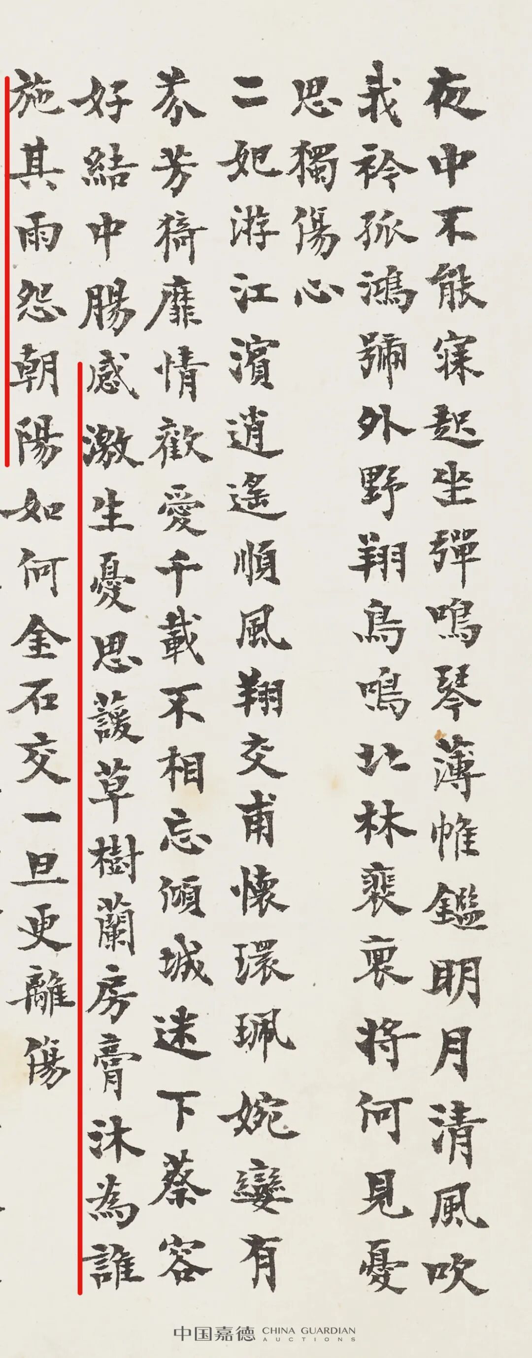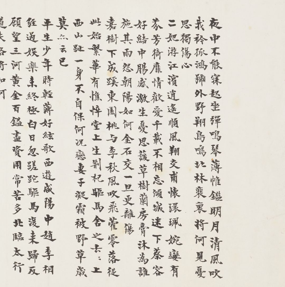 释文:夜中不能寐,起坐弹鸣琴。薄帷鉴明月,清风吹我袊。孤鸿号外野,翔鸟鸣北林。徘徊将何见,忧思独伤心。二妃游江滨,逍遥顺风翔。交甫怀佩环,婉娈有芬芳。猗靡情欢爱,千载不相忘。倾城迷下蔡,容好结中肠。感激生忧思,萱草树兰房。膏沐为谁施,其雨怨朝阳。如何金石交,一旦更离伤。